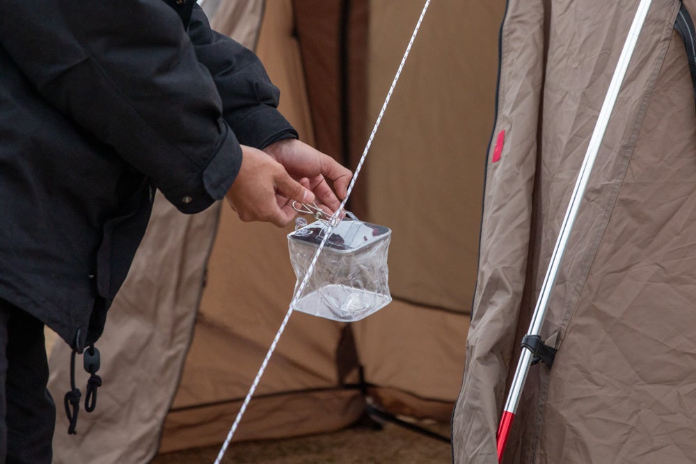 テントのロープにくくりつけておけば、暗くて足を引っ掛けてしまう、なんてことも防げます。寝ぼけ眼でトイレに行くときでも安心。