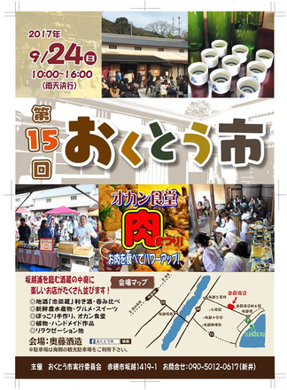 プロジェクト終了まであと2日となりました。 9月24日は「おくとう市」の日です。 奥藤酒造の蔵や中庭いっぱいにお店が並んで、一日中楽しめるイベントです♪ リターン品に前泊宿泊券と「庭酒」のお土産をセットしたものを用意していますので、ご利用くださいね。森の家からは坂を下ってすぐのバス停から、100円観光周遊バスで海沿いの景色を楽しみながら20分で到着します。 お土産の庭酒とは、播磨国風土記編纂(へんさん)当時の製法で再現した、酸味が強く甘酸っぱいお酒で、それでいて後味が爽やかなお味です!森の家の起工式にも使わせていただいたんです。 ▽原料米は播磨産の米を使用▽精米歩合は食用米と同程度の90%前後 ▽酒母に生●(きもと)もしくは山廃●(やまはいもと)を使用する