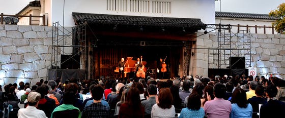 お薦めは城跡の野外会場です。ホールにはない臨場感があって、鳥の声や飛行機の雑音の中にうっとりするような音色が響きます。前の方に座ると演奏家のアイコンタクトや、充実した笑顔がはっきりと見えるのが醍醐味です。