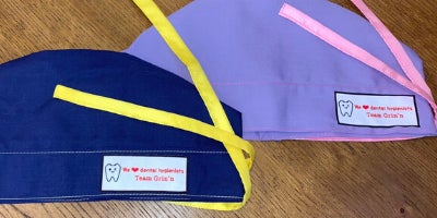 オリジナルのオペ帽を作成しました。色は2色で、ラベンダー色に光沢あるピンクの生地でリボンが結べます。ネイビー色には光沢ある黄色のリボンを合わせています。ワッペンには”We ❤︎ dental hygienists"の文字が入っています。