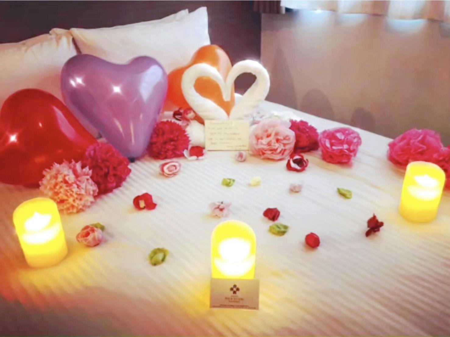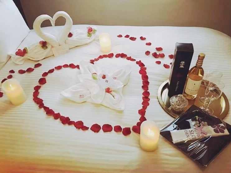 ある日、お客様から「今度、結婚50周年で京都へ旅行します。楽しみにしています。」というメールが届きました。お泊りの日に、お客様へサプライズのプレゼントをしたいと思い、お部屋のベッドを記念日用にデコレーションをして、プレゼントを添えておきました。
