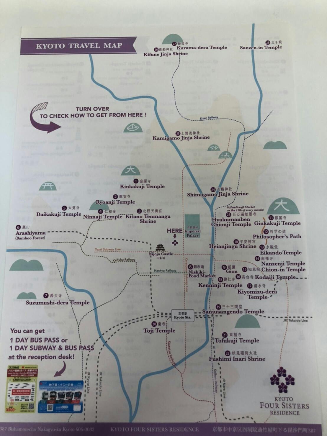 こちらは、フォーシスターズレジデンスからバスや電車で行ける、京都市内主要観光地へのアクセスMAPです。