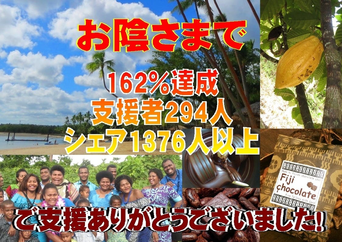 2020/09/02 08:28本日、プロジェクトが終了いたしました!!!初挑戦にして目標金額の162%を達成できたのも、支援してくださった294人の方々や、クラウドファンディングの情報を広めてくださった1376人以上の方々のおかげです。みなさんの温かいご支援に心から感謝しております。みなさん誠にありがとうございます!!そして、クラウドファンディングを行ったことによって勇気を得ることが出来ました。チョコレートのみならず我々の志にも賛同いただけた事実は、今後の運営の励みになります。このフィジーでの試みは継続こそが肝になり、互いの成長にもつながると信じております。今回の挑戦により、みなさんに喜ばれる製品をつくり、材料をつくるフィジー人にも喜ばれる企業でいられるよう努力し続ける力となりました。これで、ひとまずチョコレート工場は窮地を乗り切れそうです。しかし、まだまだ課題は山積みで安心は出来ませんが、諦めることなく頑張りますので引き続き応援よろしくお願い致します。また、コロナが収まり機会がありましたらぜひフィジーへ遊びに来てください!『支援されたら成果で返す、恩返しだ!』と言うことでいろいろな意味で恩返しできるように現地で奮闘してまいります。これからも末永く、何卒宜しくお願い申し上げます。代表 田中 光康 もっと見る南国フィジーのチョコレート工場を守れプロジェクトにご支援頂いたみなさまへ