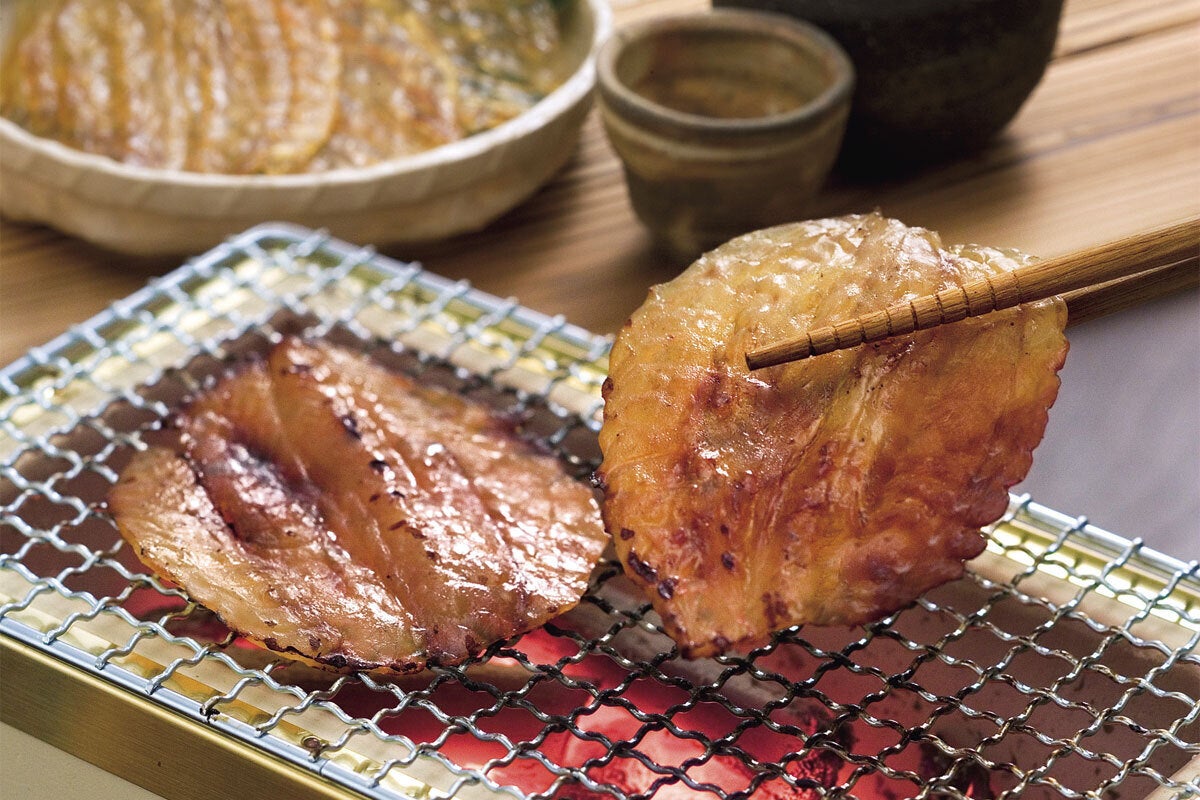 ふぐ味醂干……弊社で最も売れているふぐの珍味です。一枚、一枚を工場の熟練のおばさん達の手によって捌き、秘伝の特製ダレに漬け込み干し上げています。香ばしく焼いていただけば、噛めば噛むほど甘くて味わい深い珍味をお楽しみいただけます。単品の1枚入りと2枚入り、箱に入った4枚入りの3種類ございます。