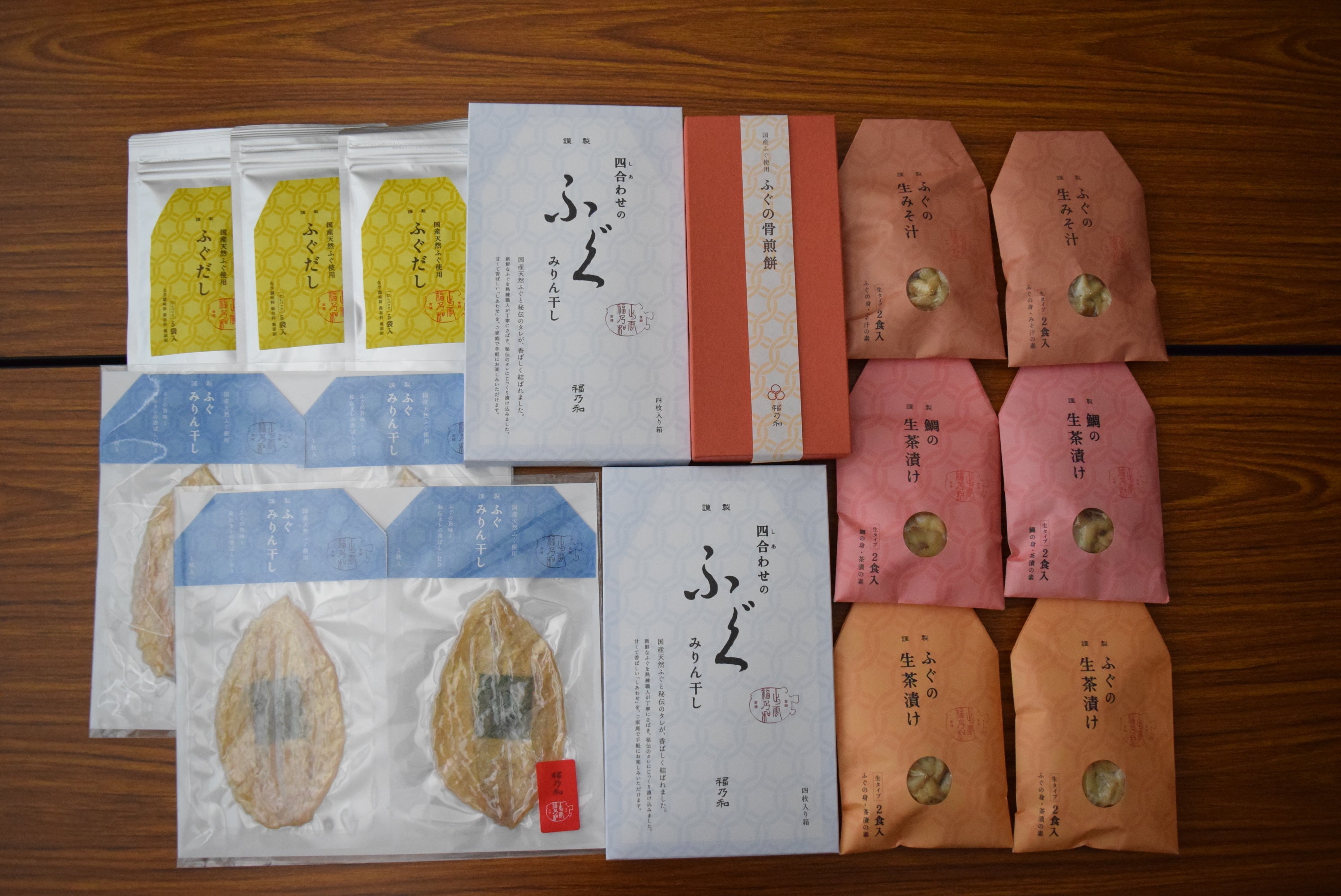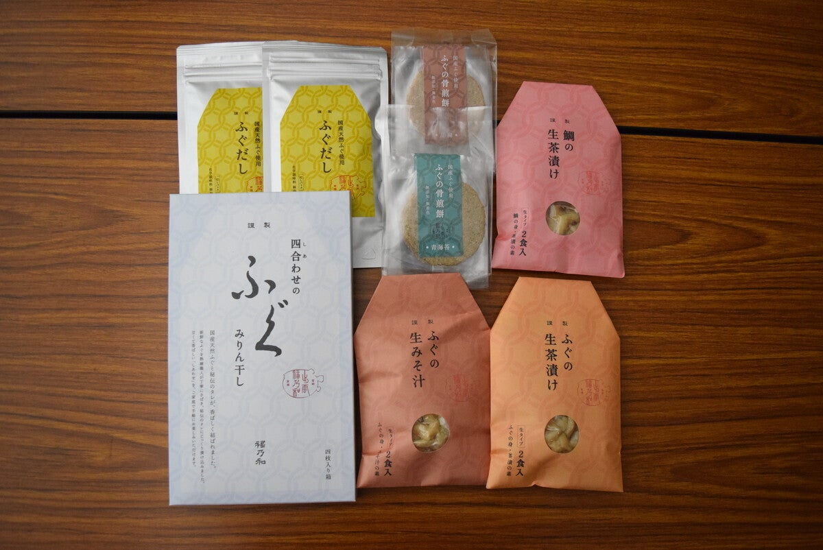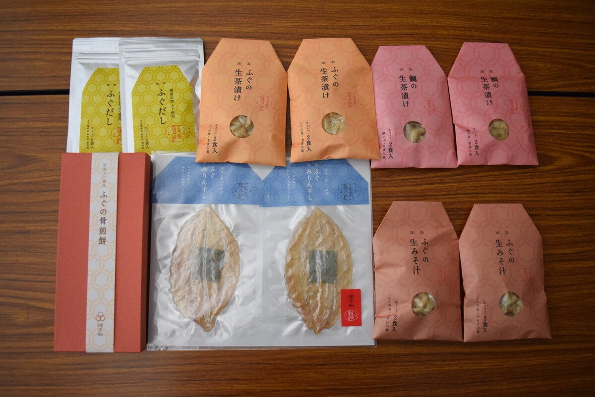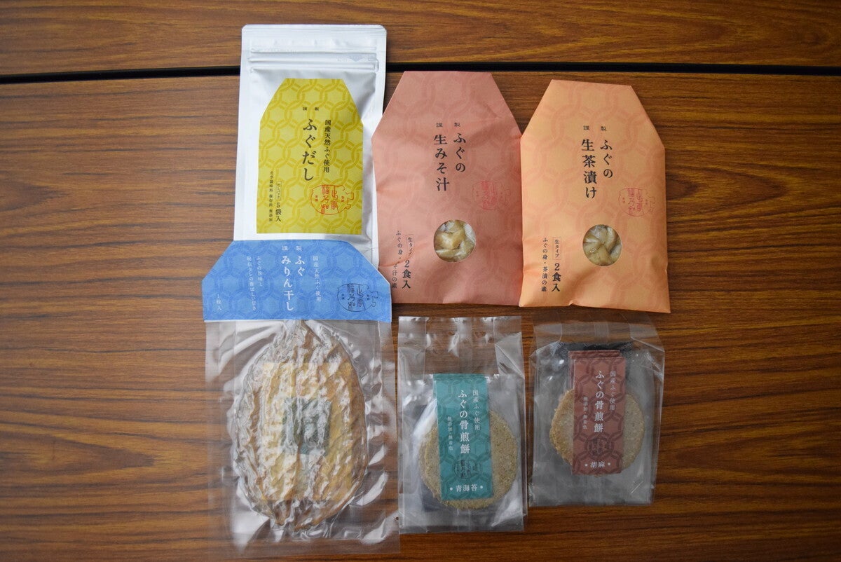 ①ふぐ味醂干(単品)×1、ふぐの生茶漬け×1、ふぐの生味噌汁×1、ふぐの骨せんべいごま味×1、ふぐの骨せんべい青のり味×1、ふぐだし(5袋入り)×1