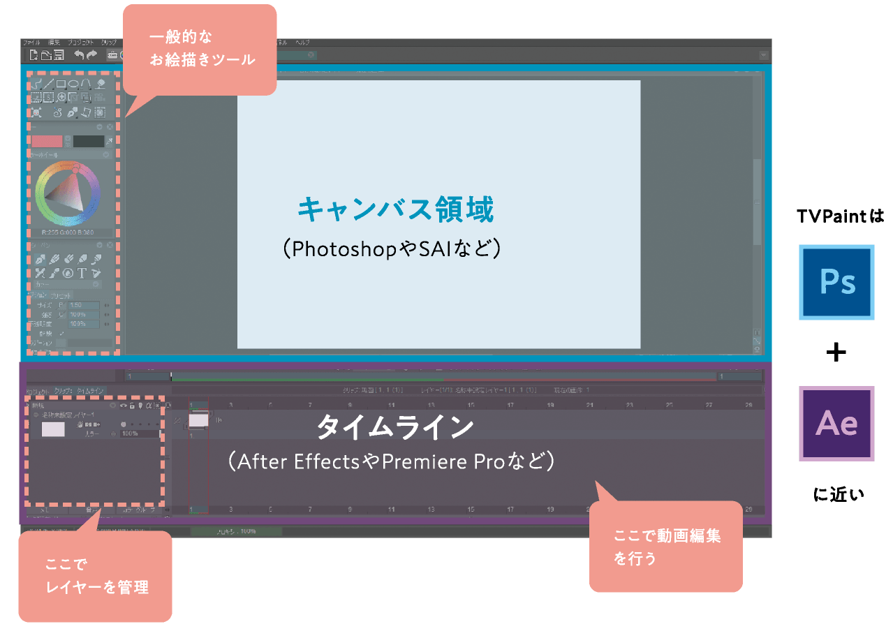 このソフトの特徴は、2Dアニメーション制作に特化した機能と画面の構成(インターフェース)を持っている点です。
