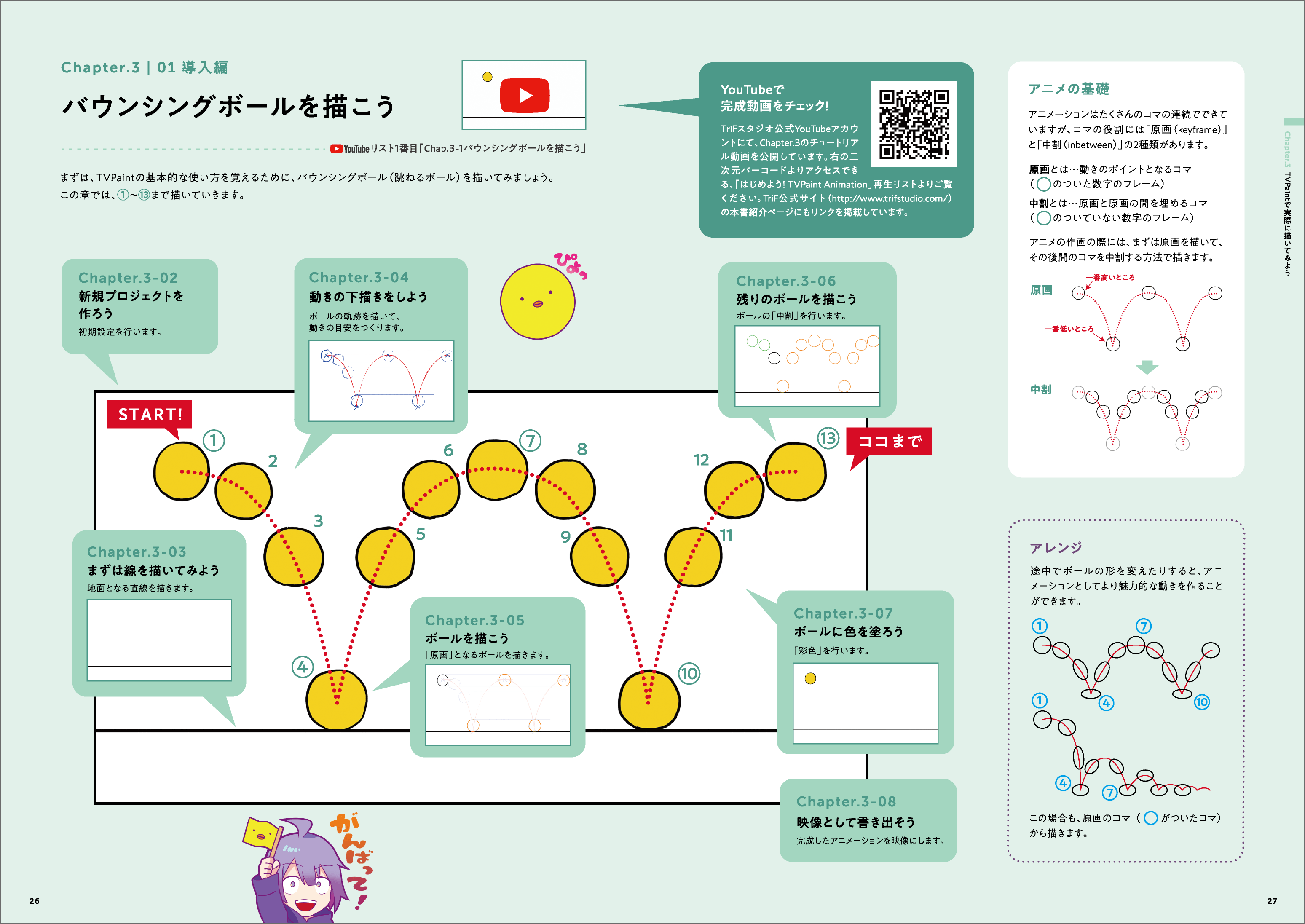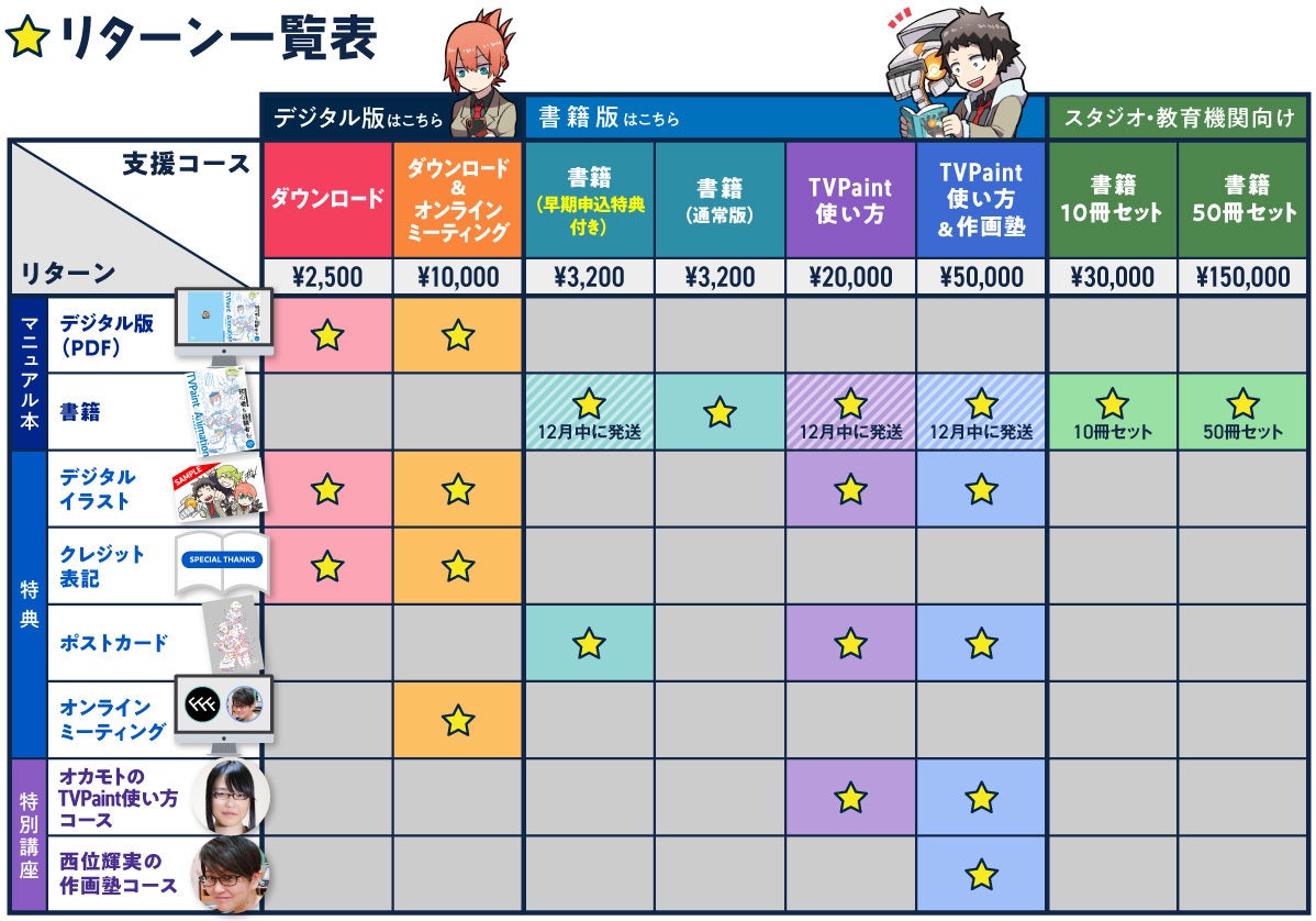 2020/12/27 16:16こんにちは!TriFスタジオの山内です。Chapter.3「TVPaintで実際に描いてみよう」の操作を収録した、YouTube解説動画をアップしました。『はじめよう!TVPaint Animation』解説動画 再生リスト(全8本)https://youtube.com/playlist?list=PL2peXFaSQjMHobGaW1gDB_qnwacWX5p0m「Chap.3-1バウンシングボールを描こう」から「Chap.3-8 映像として書き出そう」まで、3章で紹介する一連の基本操作をチュートリアル動画でも説明しています。ぜひ、動画も一緒にご覧ください! もっと見る- 支援者の皆様、こんばんは。TriFスタジオの山内です。 大変長らくお待たせいたしました!【書籍(早期申込特典付き)コース】 、【TVPaint使い方コース】 、【TVPaint使い方&作画塾コース】 リターンを選択いただいた方に向けて、書籍と特製ポストカードを本日発送いたしました。お手元に届くまで、今しばらくお待ちくださいませ。デジタル版やサンクスイラストにつきましても準備中です。来週お送りいたしますので、もう少々お待ちくださいませ。 どうぞよろしくお願いいたします。 もっと見る