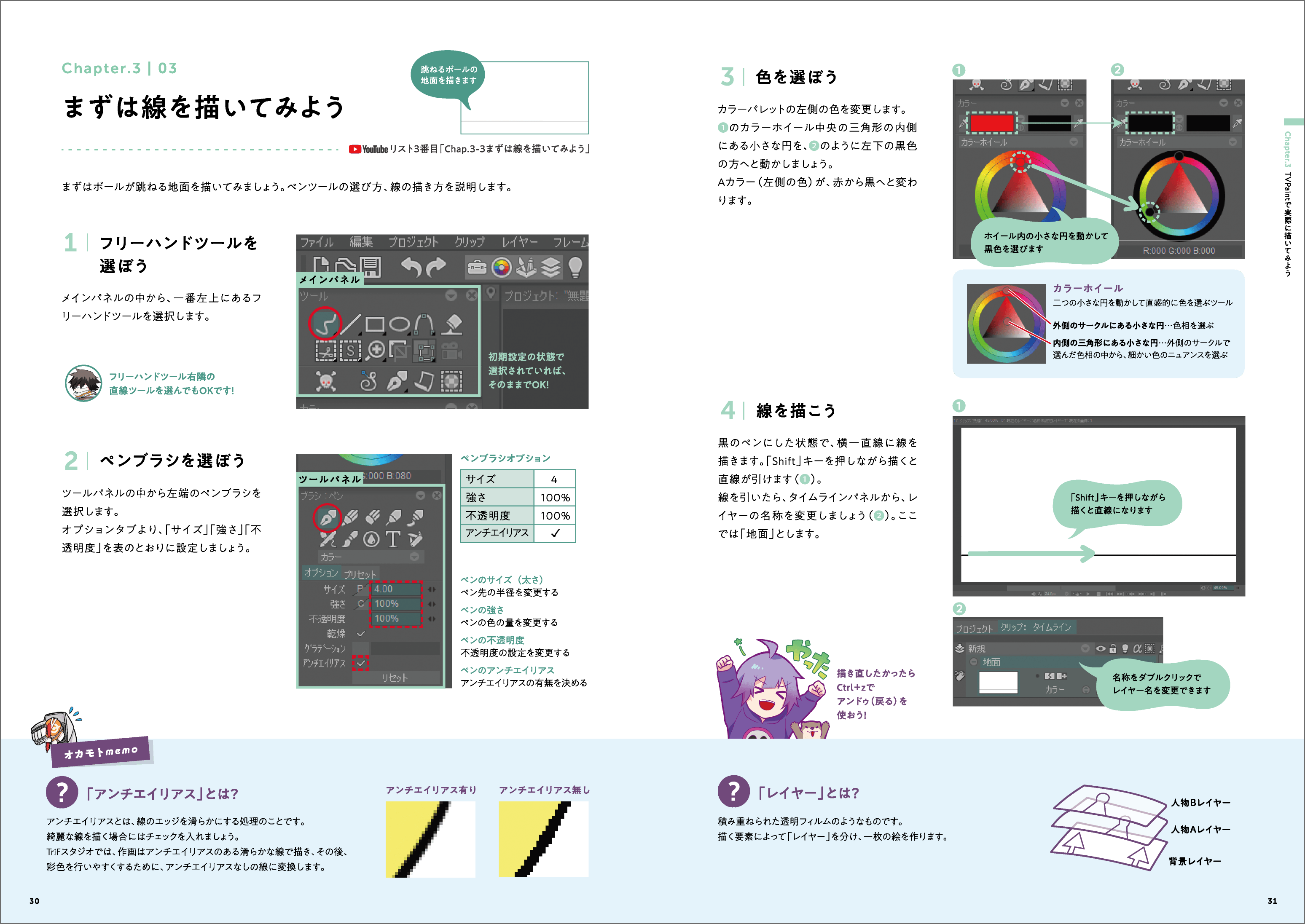 本書の見所は、なんといっても3章です。「デジタル作画がはじめてでもソフトを使えるようになる」という目的を叶えるため、1見開き1ステップで、できるだけストレスを感じずにソフトの基本機能を触れるように作りました。3章を通して取り組めば、ソフトの簡単な基本操作はできるようになるでしょう。