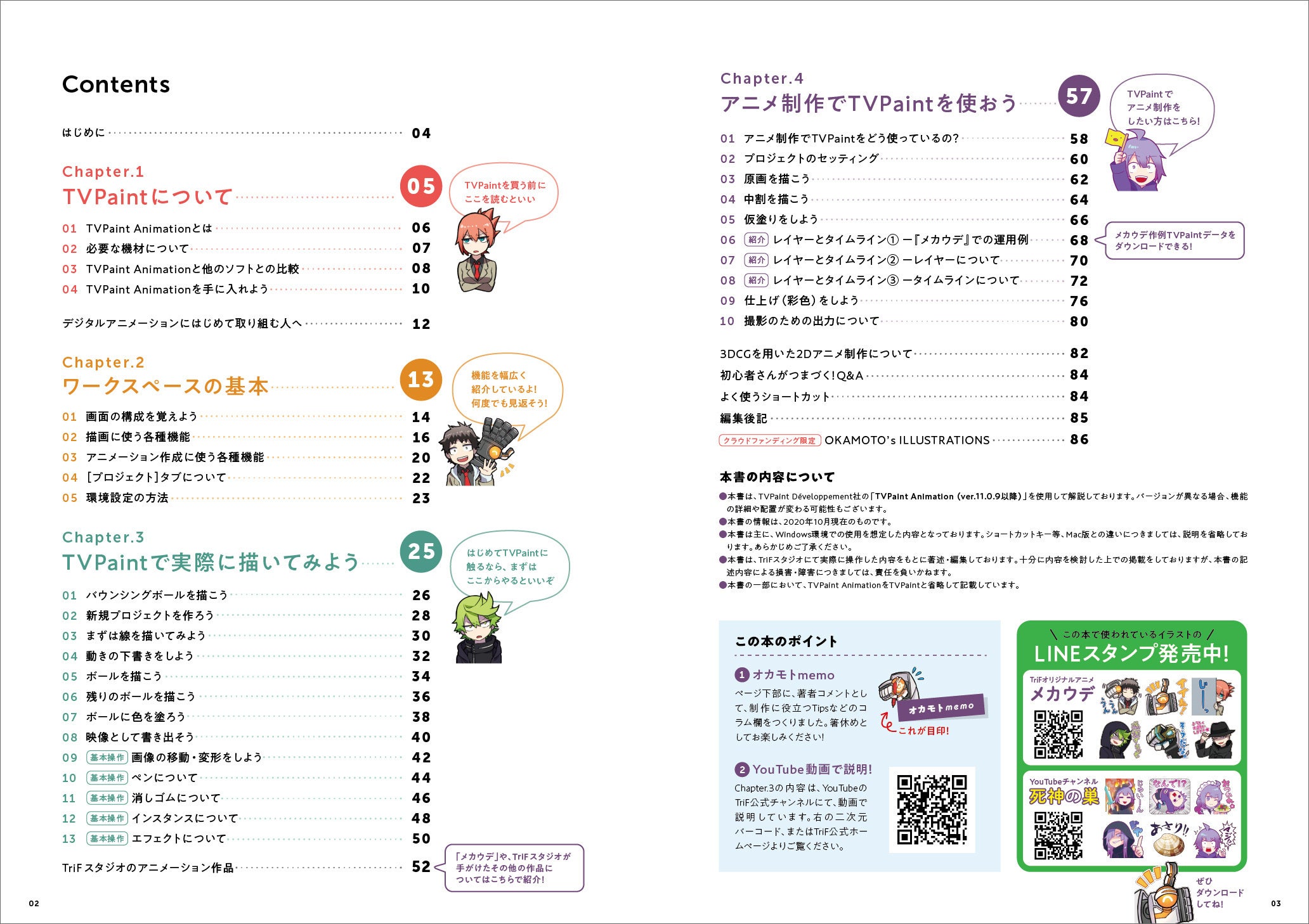 今回お届けするのは、本ソフトのTriFスタジオにおけるノウハウをもとに制作した本です。初めてソフトに触る方から、本格的にオリジナルアニメを作ってみたい方まで、ターゲットを幅広く想定して本書を作りました。私たちの本を通して、「アニメをイチから作ってみたい」と考えている方のヒントとなれば幸いです。