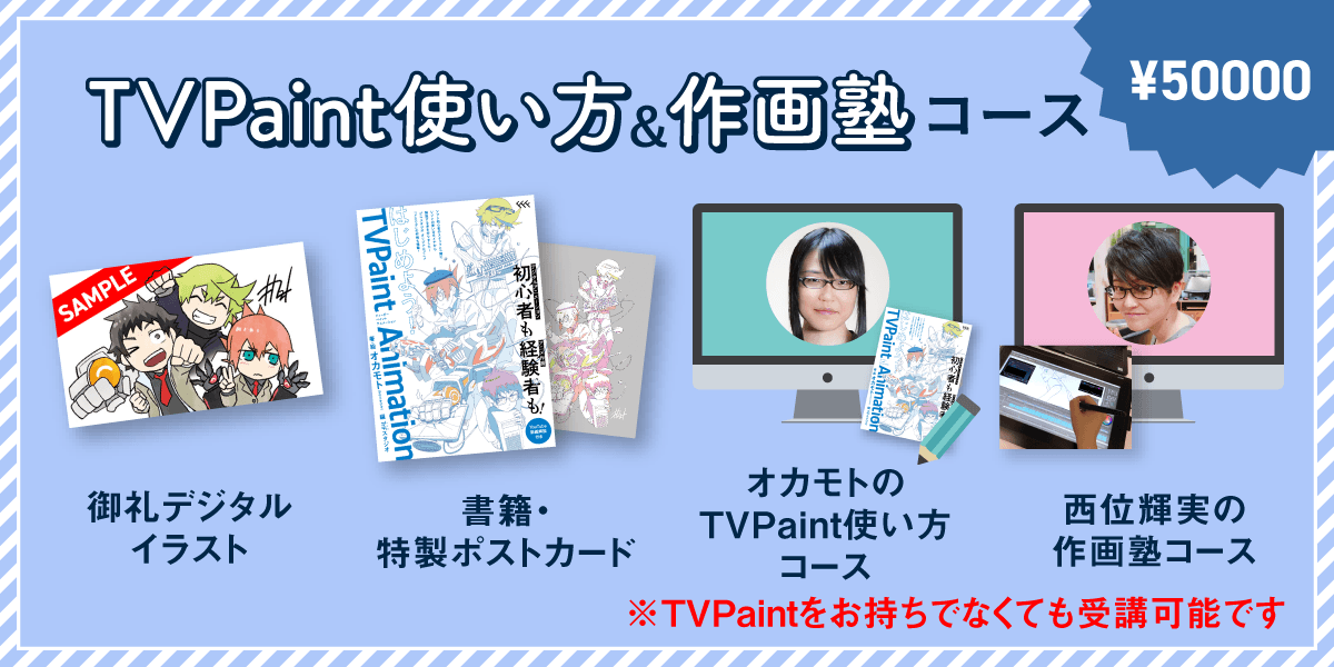 ※本講座コースを受講する方は「オカモトのTVPaint使い方コース」 も受講いただけます。2021年1~3月の期間のどこかで(土or日を想定)、後日開催日程を調整させていただきます。