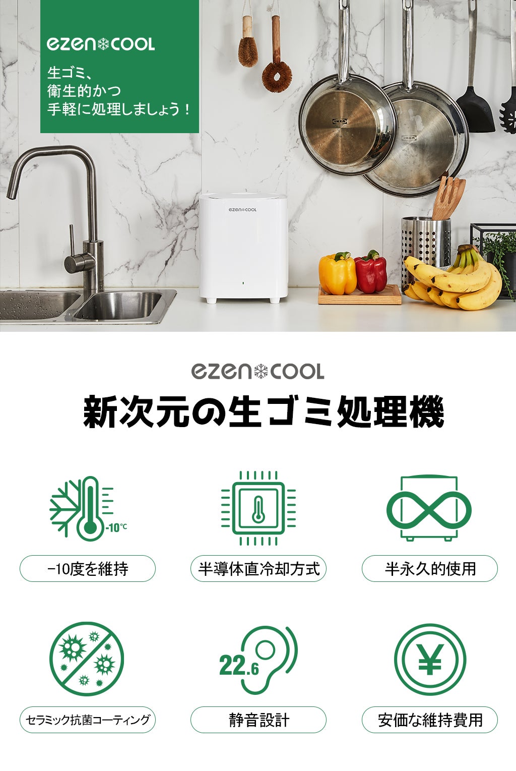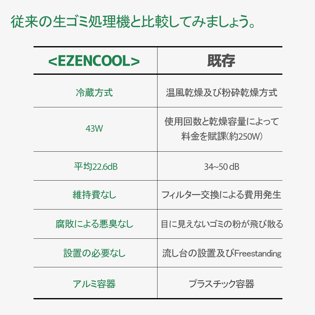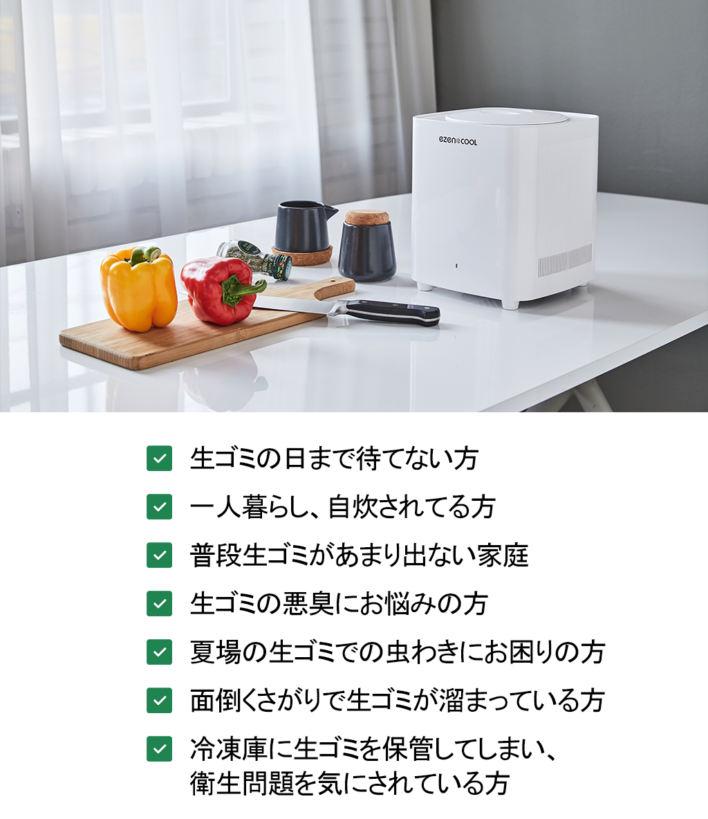 <EZENCOOL>は、生ゴミが発生すると即時に、かつ衛生的に処理するために誕生した、生ゴミ処理機です。