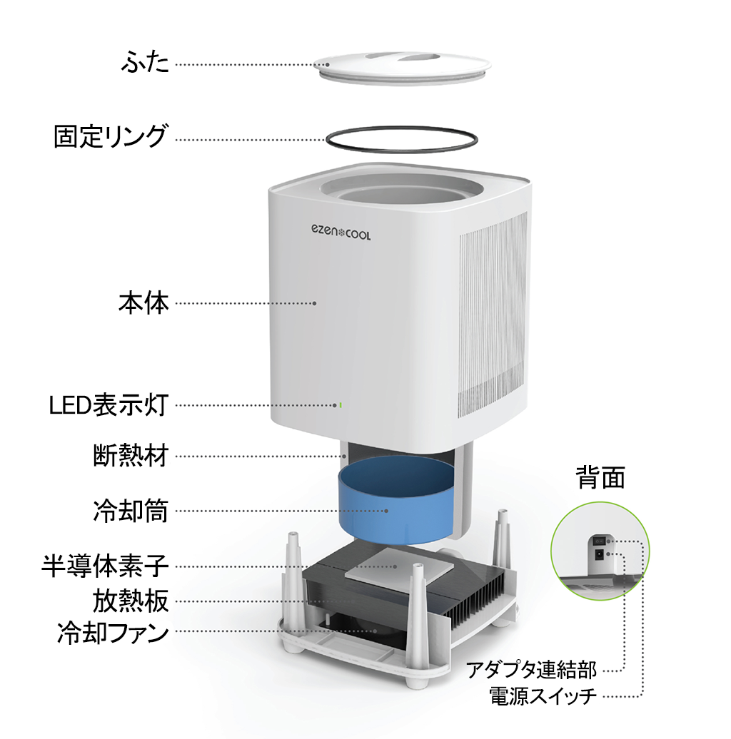 したがって<EZENCOOL>は、半導体素子方式を採用しており、騒音が少ないので振動や発熱がありません。即時冷蔵のように温度応答性が非常に良く、さらには冷媒ガス漏れ、腐食性液漏れといった心配がないのです。環境に危害のない小型軽量冷蔵庫のような感じですね。