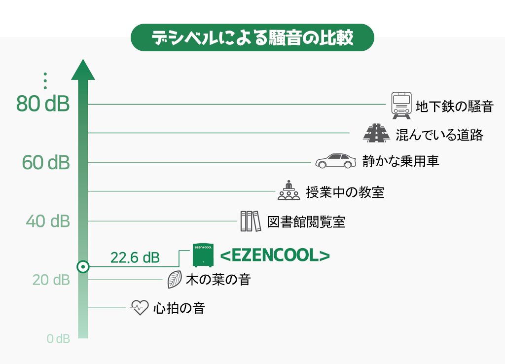 どの家庭にもある冷蔵庫の騒音に生ゴミ処理機の騒音まで加わったら気が滅入ってしまいますよね。<EZENCOOL>はモーターやコンプレッサーを使用していないため、うるさい騒音が発生しません。<EZENCOOL>は22.6dB、図書館よりも静かです。