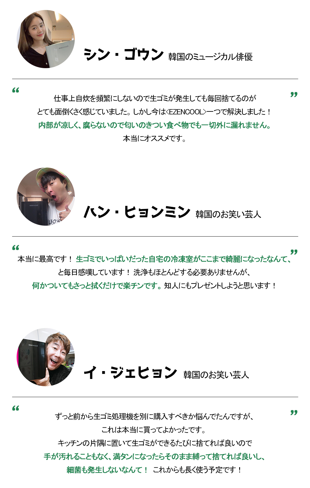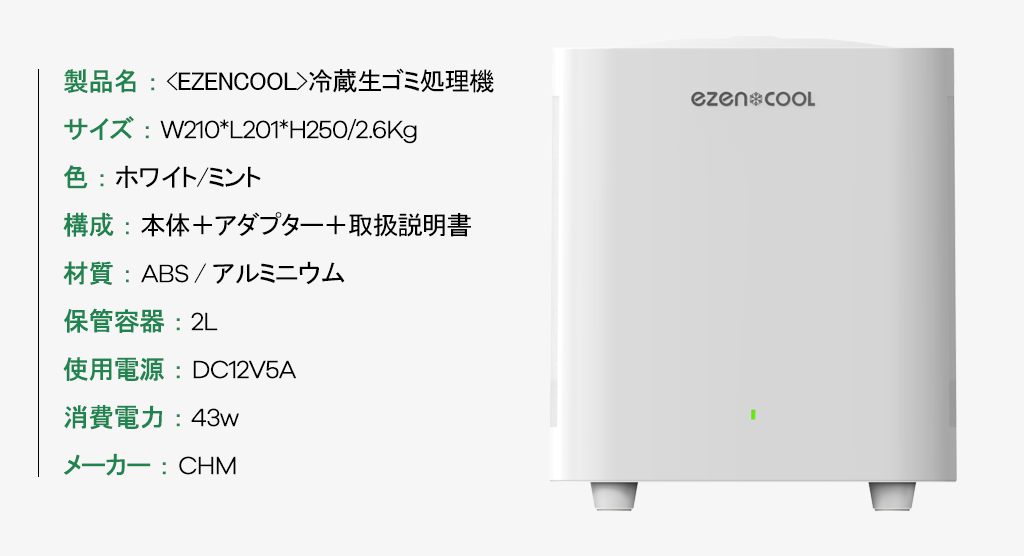 こんにちは。(株)CHMの代表、チョン・ガンヨンです。 「CAMPFIREを通して支援者の皆さまとお会いできて、心から嬉しく思っています。 「今回ご紹介する製品<EZENCOOL>は、生ゴミを衛生的、かつ簡単に処理することのできる生ゴミ処理機です。」 生ゴミに関して不便な思いをしたことがある方なら、<EZENCOOL>に大満足するはず!私たち(株)CHMは、日常に欠かせない部分を技術と組み合わせて、生活と環境に役立つ製品を作り、私たちの生活の価値を高める製品づくりを目指し、一生懸命駆け抜けていきます。 支援者の皆さんからのたくさんの応援が励みになります。 ぜひよろしくお願いいたします。