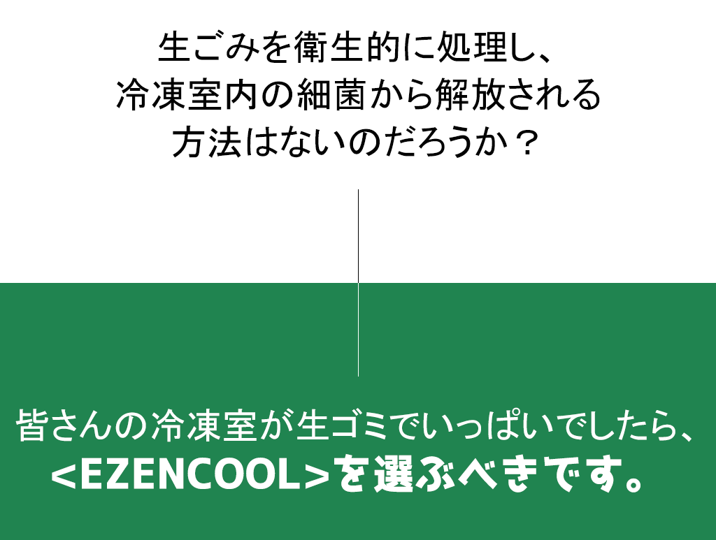 A.生ゴミから悪臭がする理由は腐敗が進むからです。しかし、<EZENCOOL>は冷却部で内容物を凍らせて悪臭の原因でもある腐敗を防いでくれます。さらに、腐敗する前の生ゴミそのものの匂いまで、2重密閉方式によって絶対に外に漏れない構造になっています。