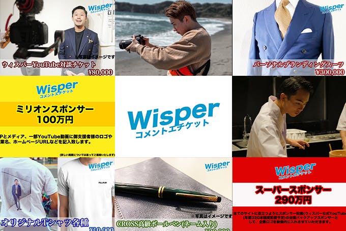 全てのサイトにスポンサー記載(ウィスパー公式YouTube(年間300本程度配信予定)の全面バックアップスポンサーとして、企業ロゴを映像内に入れさせていただきます。)