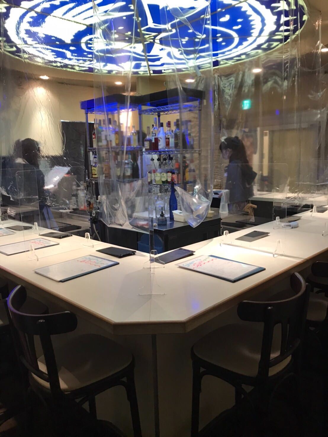 ・各席に防御魔法(ビニールカーテン)を発動します。(構造上設置できない一部店舗はマスク着用など別の対策を実施)
