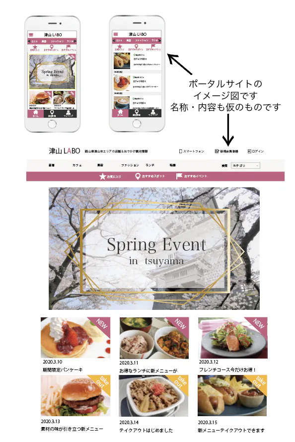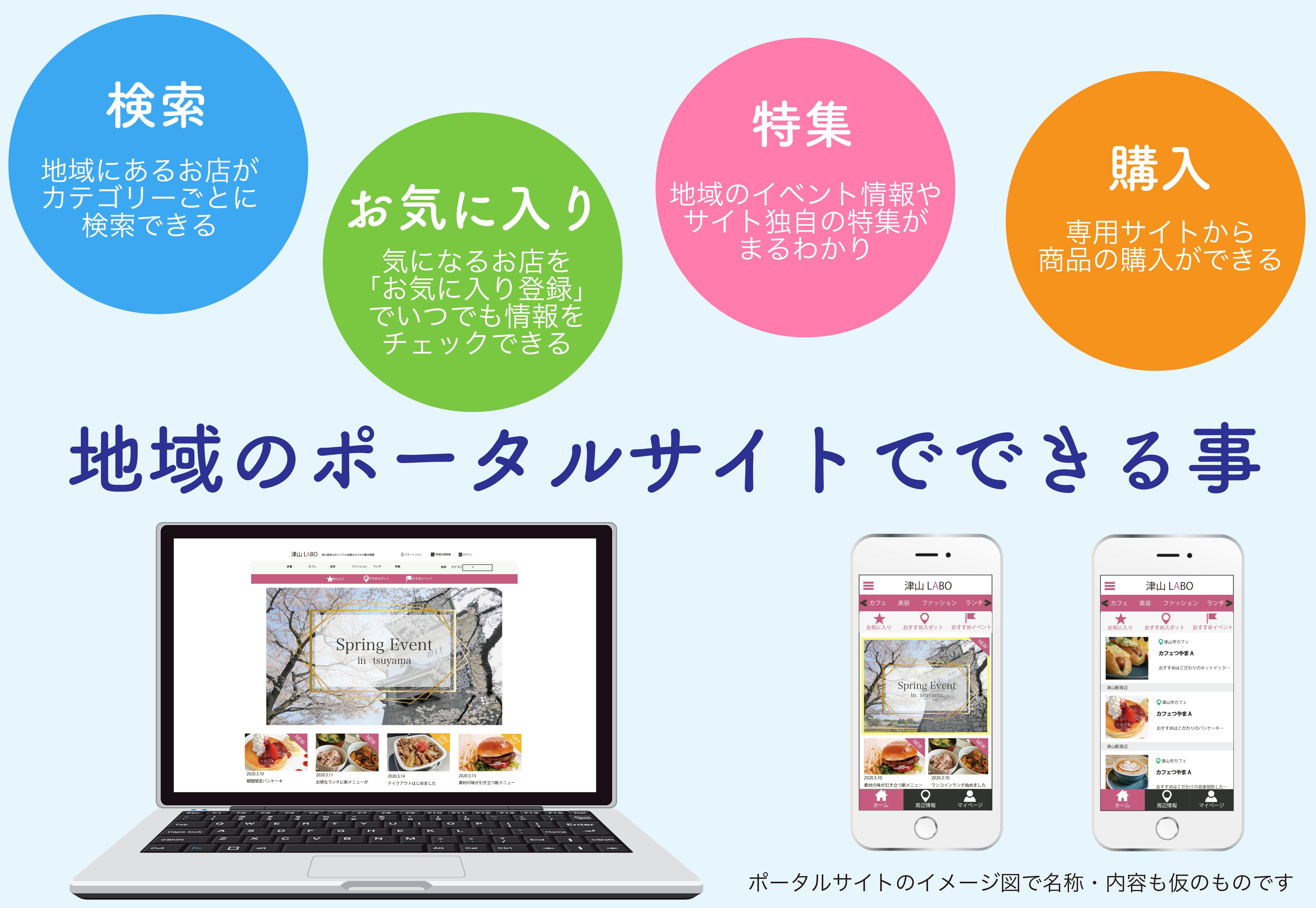 現在津山市には地域の情報をまとめたポータルサイトはなく、それがあることによって登録された事業所の方は店舗紹介ができ、商品やメニューの広告ができます。自社のホームページを持っていない方もポータルサイトを活用し広告ができます。各事業所ごとに管理画面を構築しそこから商品の販売やイベント情報やおすすめ商品など最新の情報を発信できます。