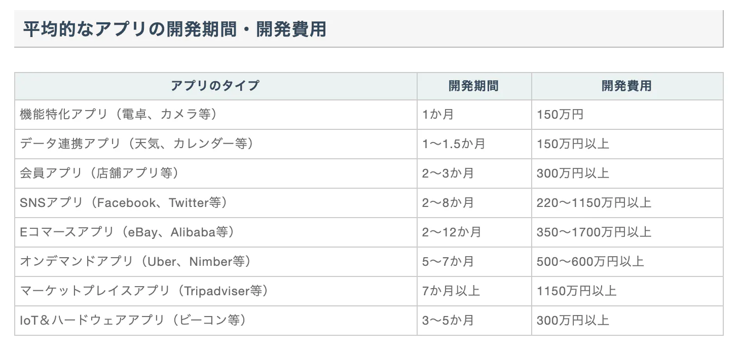アプリ開発費用の相場は以下のようになっています。