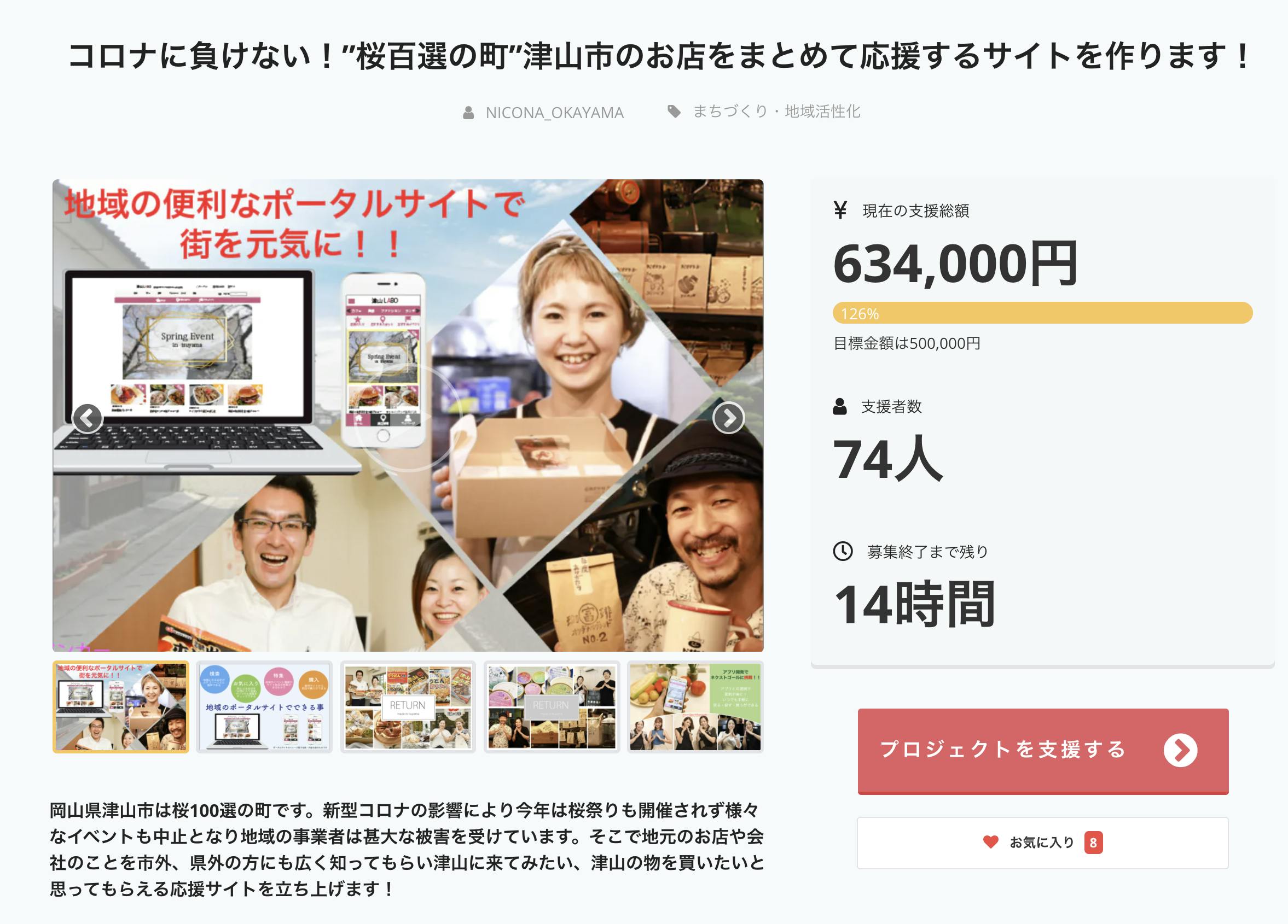2020/09/29 10:009/29(火)本日支援金募集の最終日となりました!予想もできなかったコロナ渦から、どうにか津山市という地域を盛り上げ活性化して行く方法はないかと考えクラウドファンディングに挑戦する事となり、あっという間に最終日がやって参りました。本日までに74人もの方々にご支援を頂き当初の目標金額を達成し、皆様のおかげで新たにアプリ開発のため掲げたネクストゴールに挑戦する機会を与えて頂けたことに大変感謝しております。ありがとうございます。私自身クラウドファンディングに初めて挑戦し、様々な事を経験させて頂きました。中でも一番に強く感じることは「行動する」ことの大事さを学べたということです。こんな状況だからこそ動く!!そうでないと何も始まらないですよね。そして人と人の繋がりは本当に素晴らしいものだと改めて感じることができました。さて本日最終日、残すところあと14時間☆地域のポータルサイトを作るこのプロジェクトに興味を持って頂きありがとうございます!皆様のご支援のご協力を最後までお待ちしております。どうか宜しくお願い致します。 もっと見る山陽新聞で紹介して頂きました