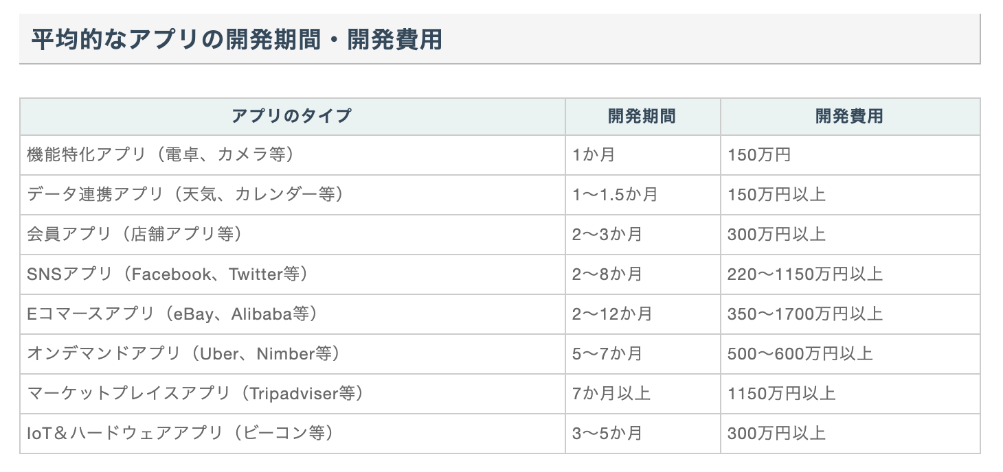 アプリ開発費用の相場は以下のようになっています。