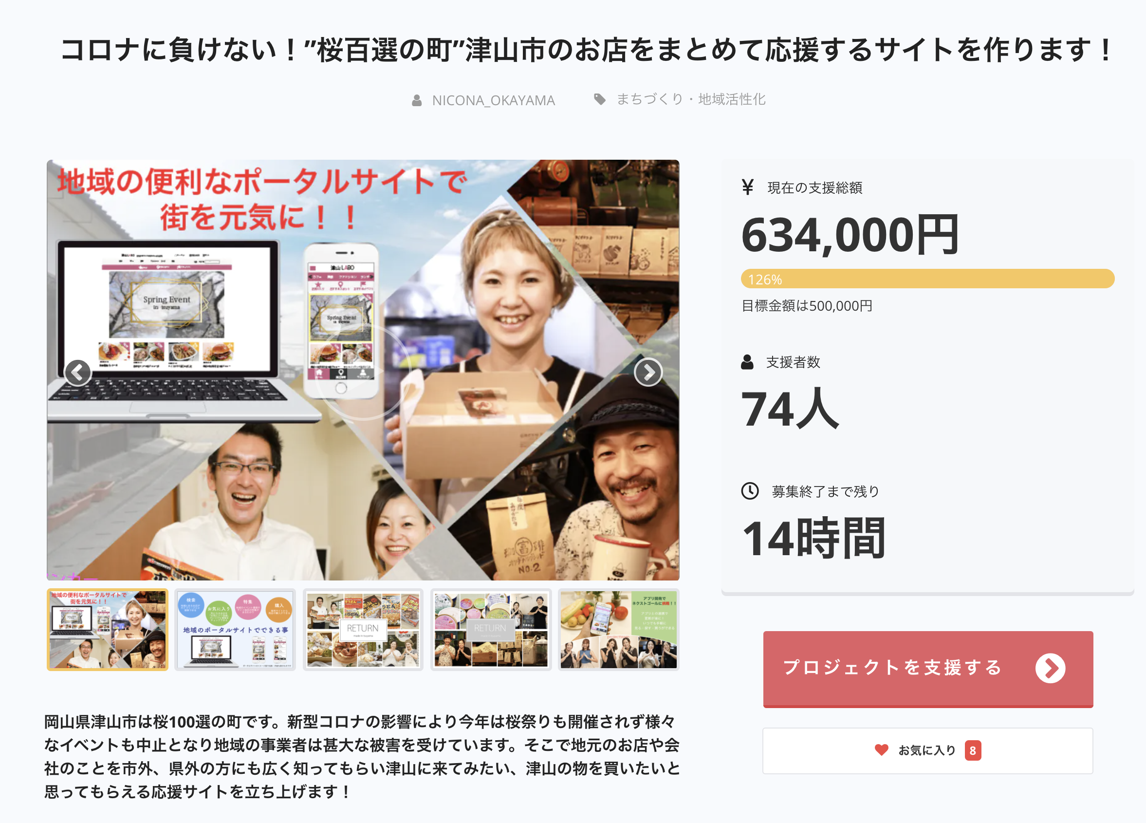 2020/09/29 10:009/29(火)本日支援金募集の最終日となりました!予想もできなかったコロナ渦から、どうにか津山市という地域を盛り上げ活性化して行く方法はないかと考えクラウドファンディングに挑戦する事となり、あっという間に最終日がやって参りました。本日までに74人もの方々にご支援を頂き当初の目標金額を達成し、皆様のおかげで新たにアプリ開発のため掲げたネクストゴールに挑戦する機会を与えて頂けたことに大変感謝しております。ありがとうございます。私自身クラウドファンディングに初めて挑戦し、様々な事を経験させて頂きました。中でも一番に強く感じることは「行動する」ことの大事さを学べたということです。こんな状況だからこそ動く!!そうでないと何も始まらないですよね。そして人と人の繋がりは本当に素晴らしいものだと改めて感じることができました。さて本日最終日、残すところあと14時間☆地域のポータルサイトを作るこのプロジェクトに興味を持って頂きありがとうございます!皆様のご支援のご協力を最後までお待ちしております。どうか宜しくお願い致します。 もっと見る山陽新聞で紹介して頂きました