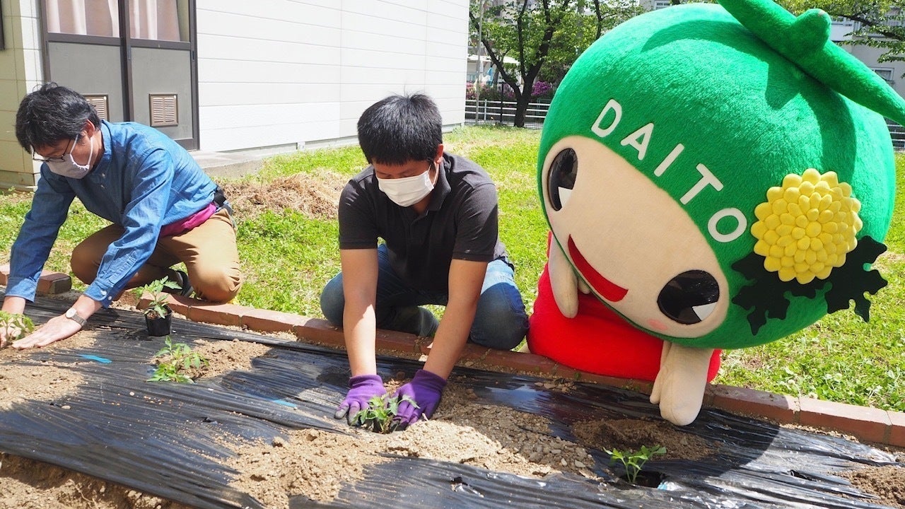 ↑苗木植え。(大東市公式マスコットキャラクター、ダイトンもお手伝い!?)