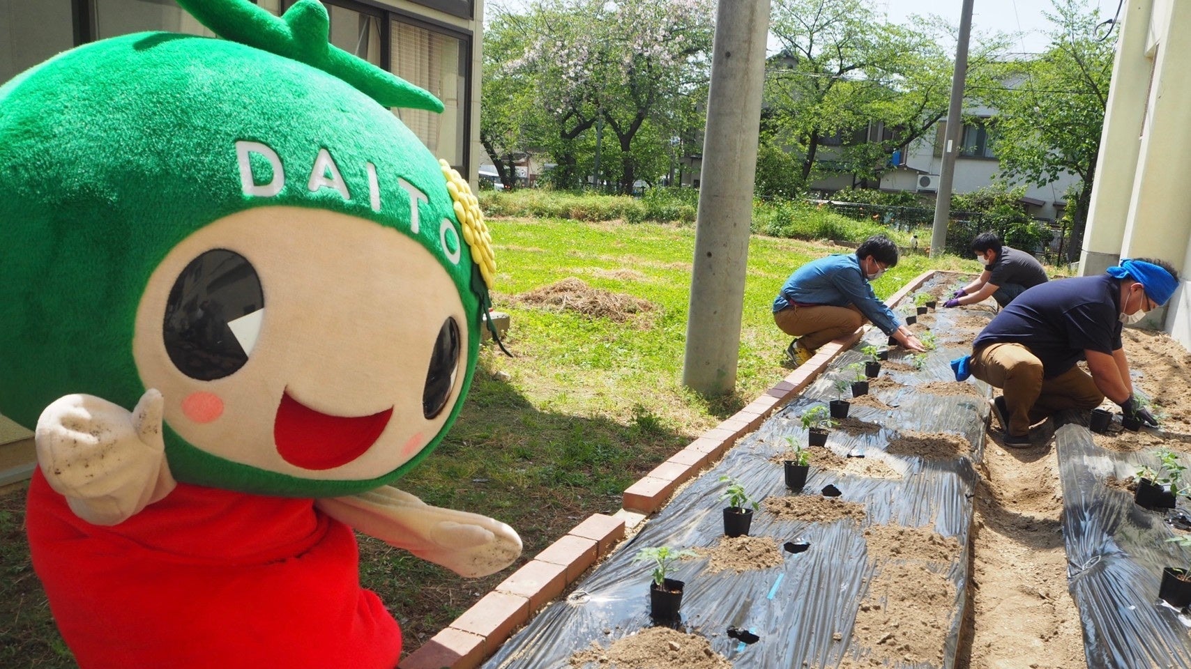 ↑苗木植え。(大東市公式マスコットキャラクター、ダイトンもお手伝い!?)