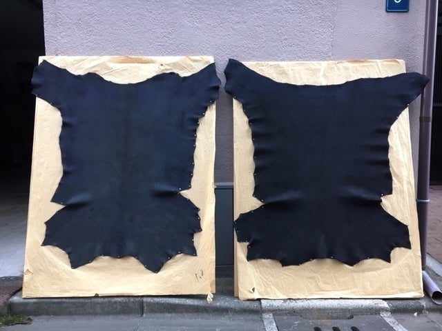 濡れた革をこのように干して縮めていきます。(左がガラ干し、右が天日干し)
