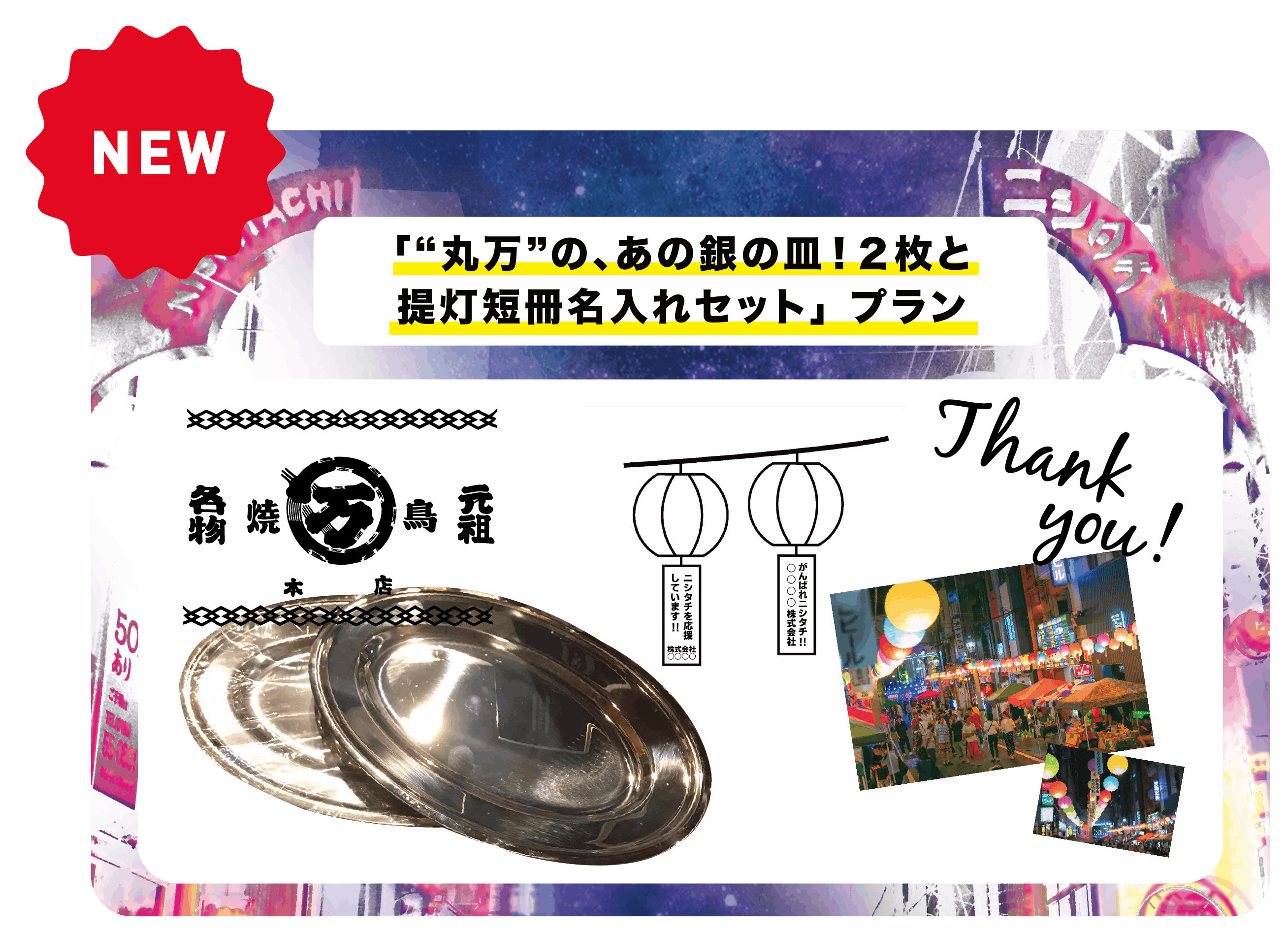 【限定7名】18,000円 「"丸万"の、あの銀の皿!2枚と提灯名入れセット」 プラン