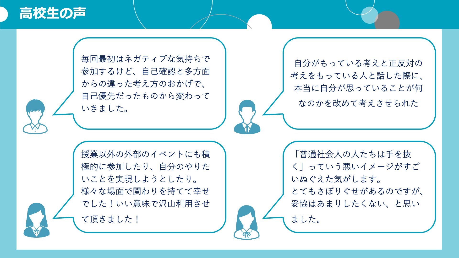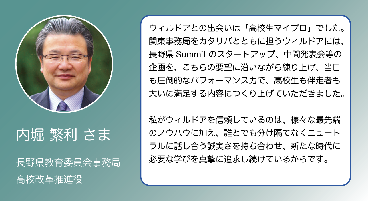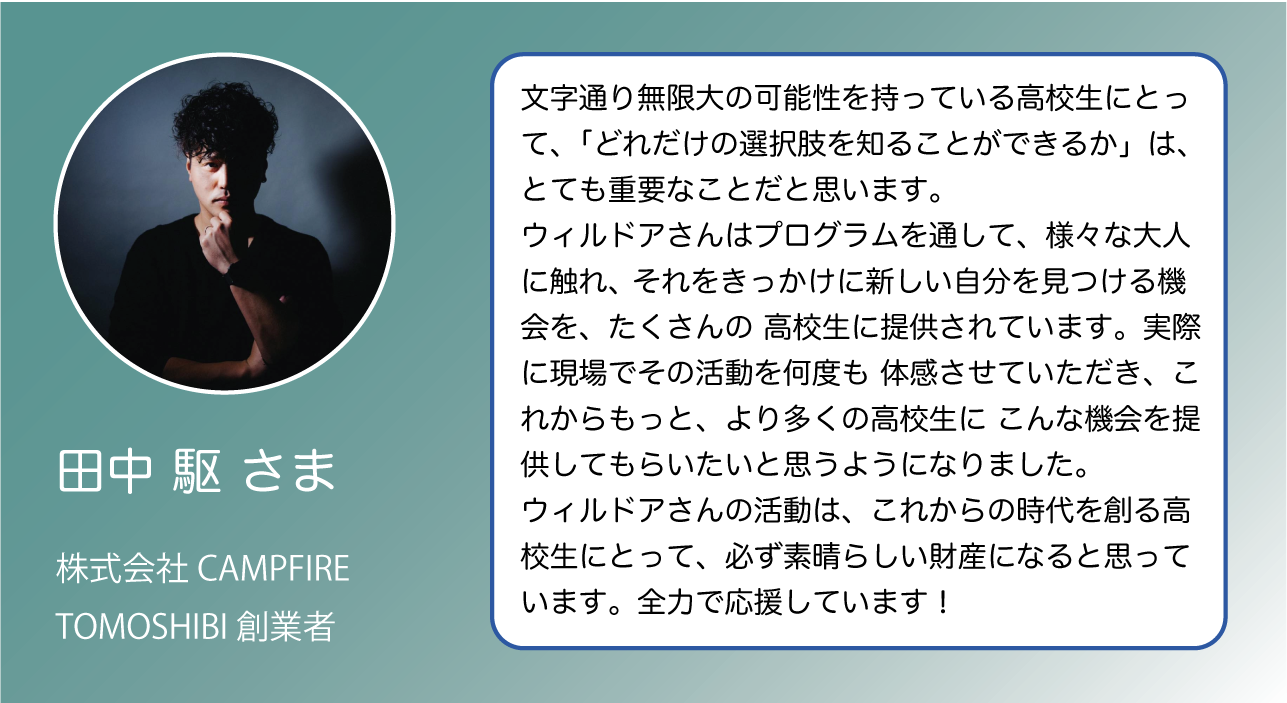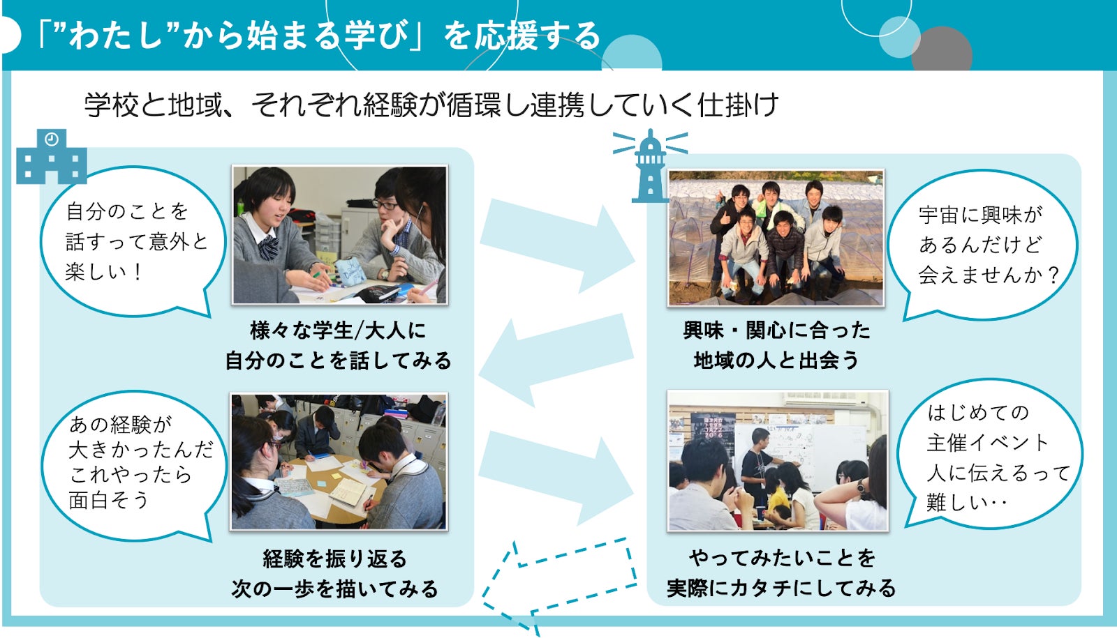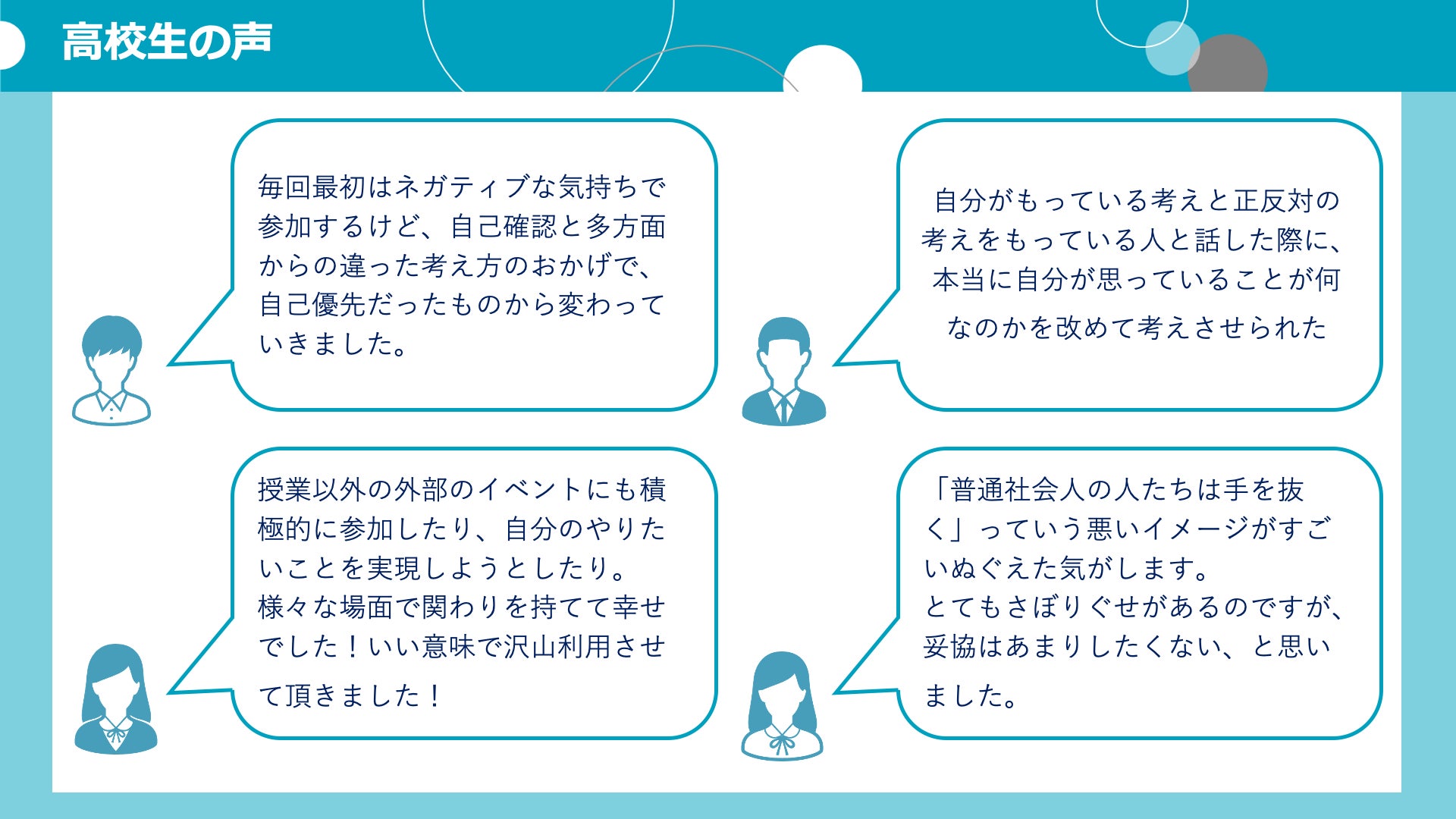私たちから、高校生へ。そして高校生からその周囲へとつながっていくストーリーを一緒に創り出し、さらにワクワクする未来へ向かうための仲間になっていただければ嬉しいです。