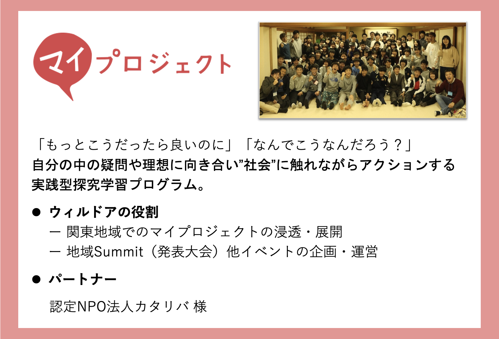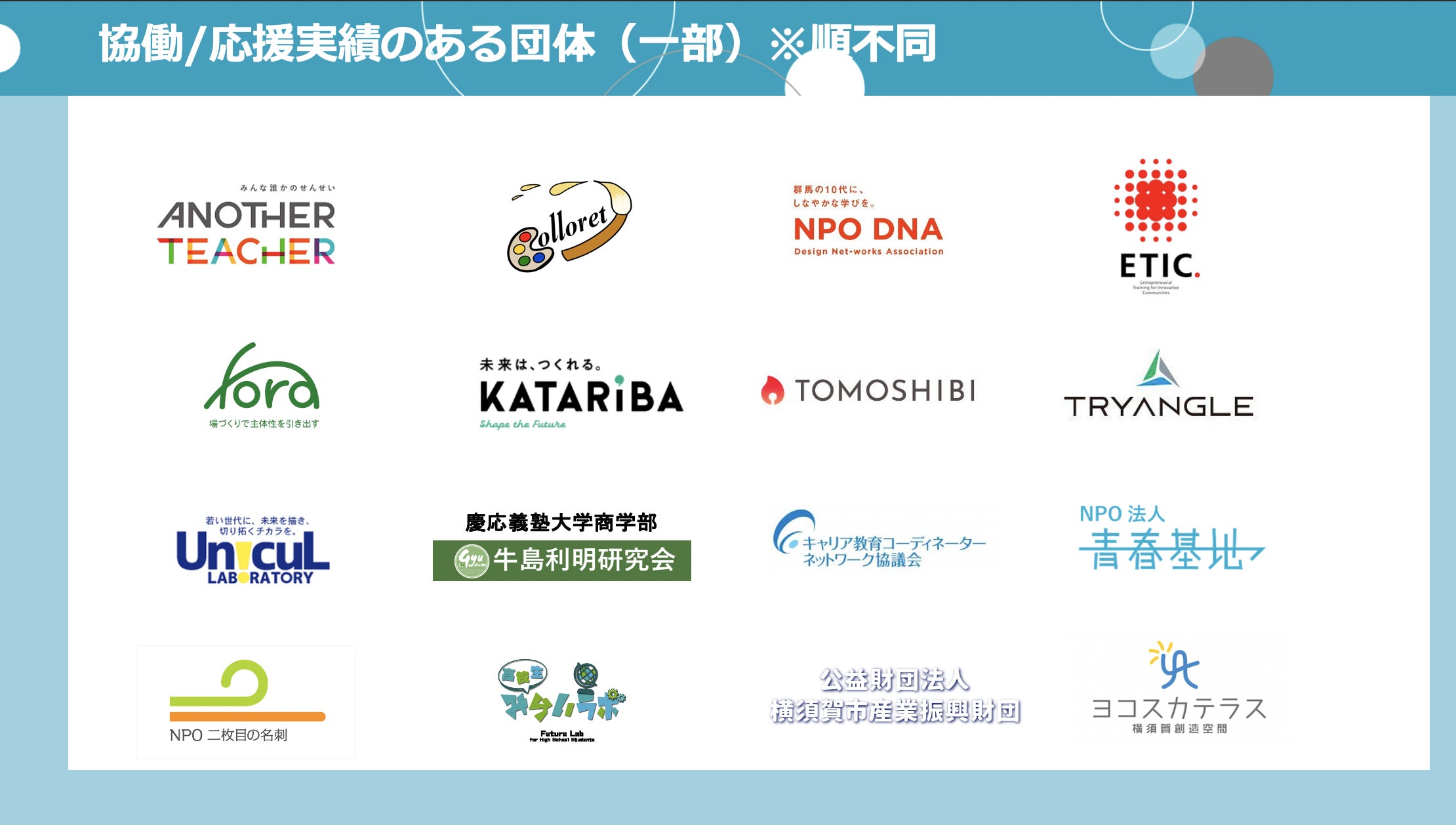 私たちは「個人こそが学びの主役」であることを大事に、多くの個人・団体と協力しつつ高校生の学びを応援している団体です。