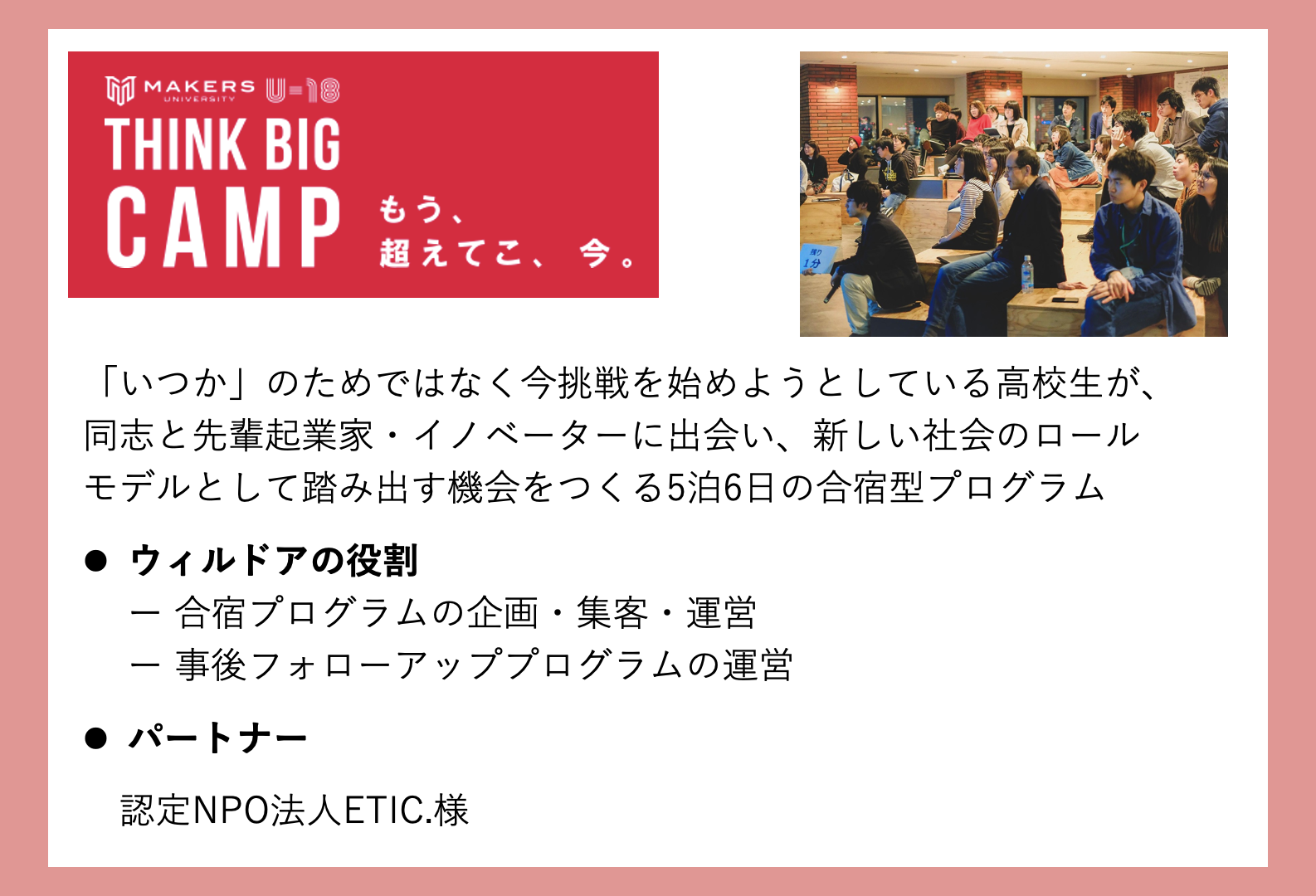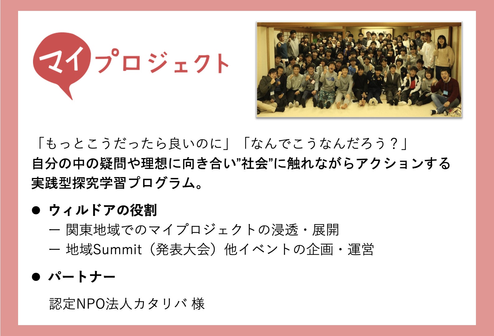 認定NPO法人カタリバと協働した”わたしを主語にした探究学習”を関東地域で広げるマイプロジェクト関東事務局の活動。認定NPO法人ETIC.の裏方として、全国の”はみだし”高校生たちが、新しい生き方のロールモデルとなっていく場を提供するMAKERS UNIVERSITY U-18の企画・運営もそのひとつです。