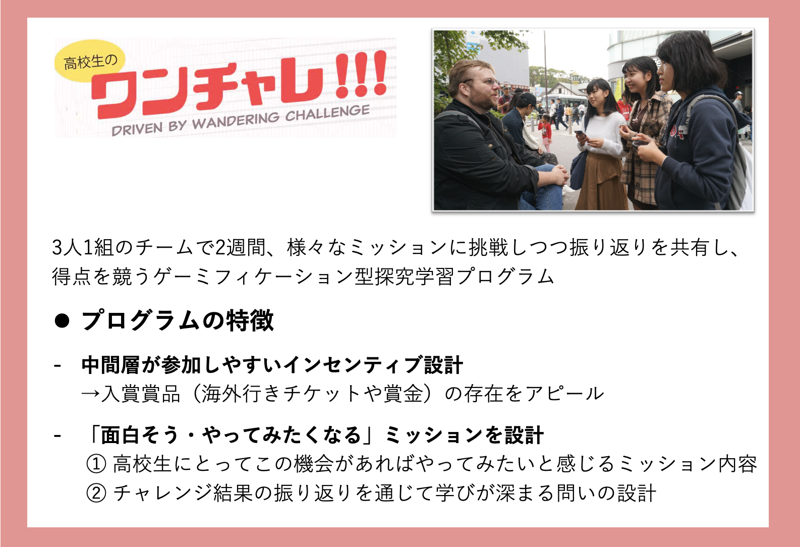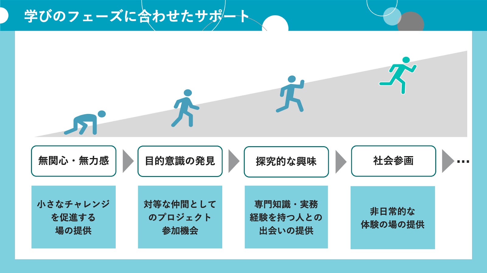 このプロジェクト最大の特徴は「一歩踏み出すのが怖い」「周りの目が気になる」そんな中間層の高校生たちが気軽に参加しやすく、活動の中で自然に学びを増やしていける設計にあります。