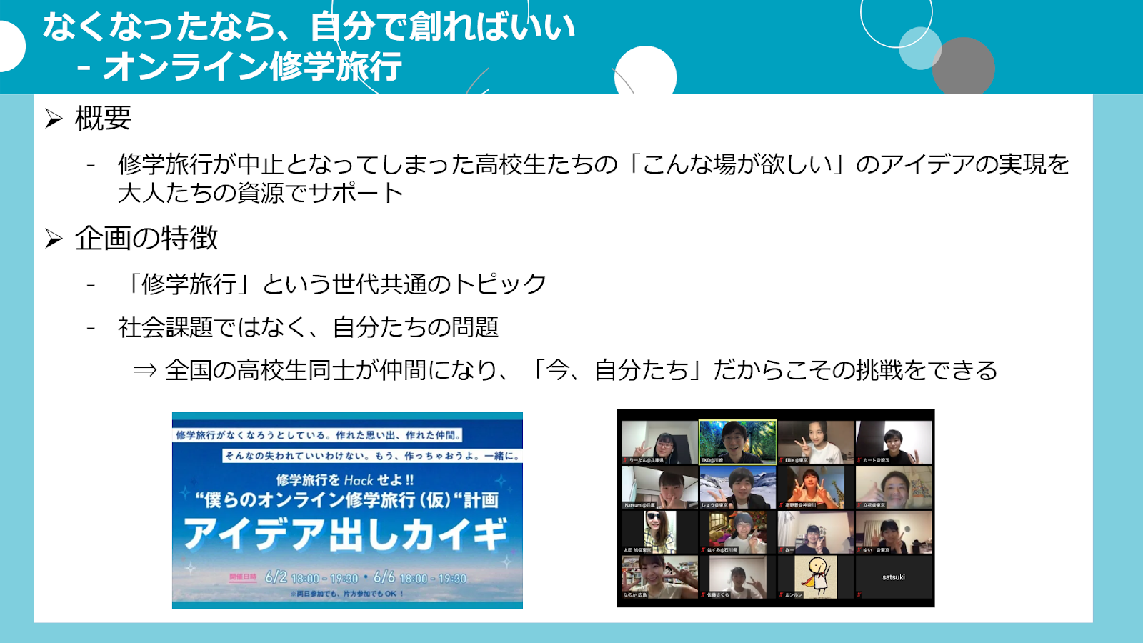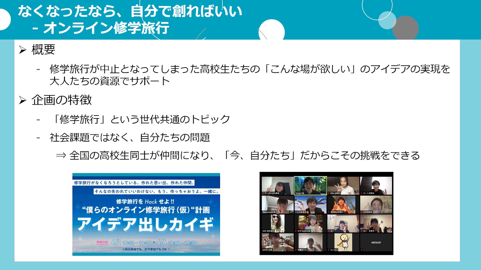 失ってショックを受けた人も多い「修学旅行」をフックに、企画することに関心を持つ高校生を集め、彼ら主導で行う「こんなものがあったら」というアイデアへの挑戦を応援したいと考えています。