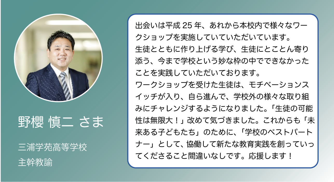 ※これを可能にしてくれるのは、目の前の生徒を最優先に考えつつ、いち個人としての価値観や経験から真摯に高校生に関わってくれる協力者の存在です。