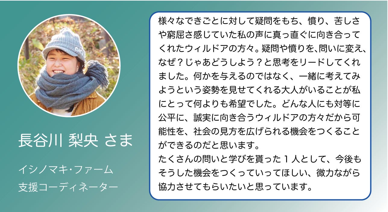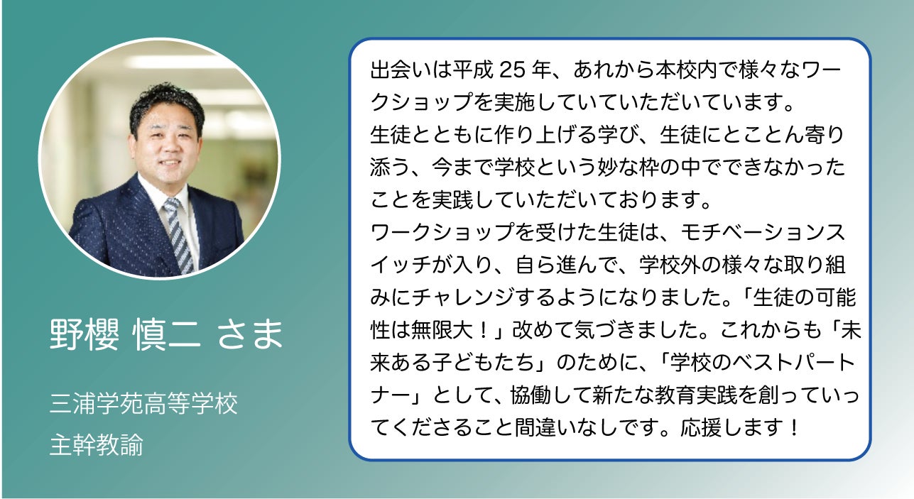 初めて横須賀の地域で行ったぼくらのプログラムを見て「ウチの学校の高校生に届けたい」と導入をしてくださり、以来5年間ずっと「次はなにを?」と一緒に考えさせていただいているウィルドアの立役者の一人です。野櫻先生の挑戦や生徒と築く圧倒的な信頼関係には、未だに驚かされることばかり…。