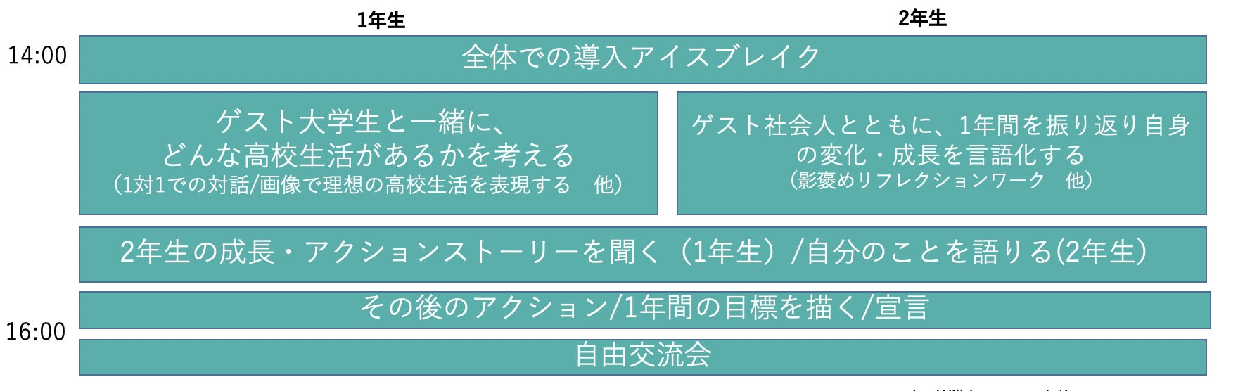 20年度初回に当たる今回は、1年生は「外部の大人と話すことでの楽しさを知り、学びを得る」「与えられた課程外での学びに一歩踏み出す意欲を高めること」を目標に、2年生は「1年間の自身の成長/変化を振り返り、次の一歩が何になるかを考える」ことを目指して場の設計を行いました。