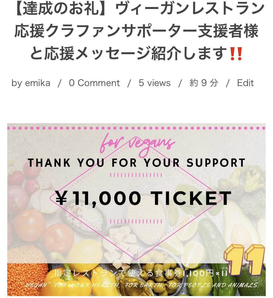 2020/08/31 12:30「チケット使いました!」と、いろんな方からご連絡いただいており、嬉しいご報告をいただいております。全体支援の方で、お名前の公開がOKな方をベジフォーピースホームページでご紹介させていただきました。また、他の皆様からクラファンページ上でいただいた応援メッセージもご紹介しています。よろしければ、ぜひご覧ください。ホームページでご案内しておりましたが、ベジフォーピースとして、コロナ支援の活動はこれで最後となり、ヴィーガン普及プロジェクトとして活動していきます。また、ベジフォーピースは農林水産省の「あふの環プロジェクト」のメンバーとなりました。来月には農林水産省のサスティナブルを推進するキャンペーンを企画しており、皆様からの応援の言葉を励みに、人にも地球にもやさしい食事を広く普及していきます。活動の紹介につきましては、Facebook、インスタグラム、Twitter等でご紹介しておりますので、ぜひフォローをよろしくお願いします!https://mirai-sanpo.com/https://www.facebook.com/groups/2642866892650403/?ref=sharehttps://mobile.twitter.com/vegepeacehttps://www.instagram.com/vegeforpeace/ もっと見る
