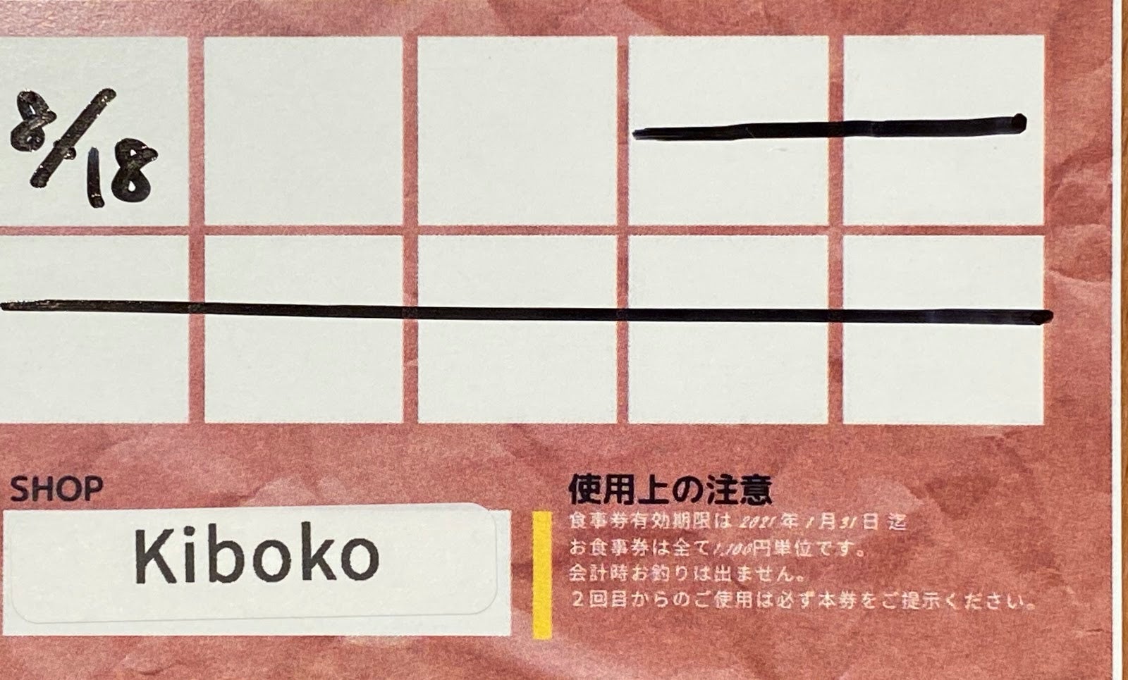 ・1マスが1100円になっています。ご使用になった日付けをお店で記入してもらいます。