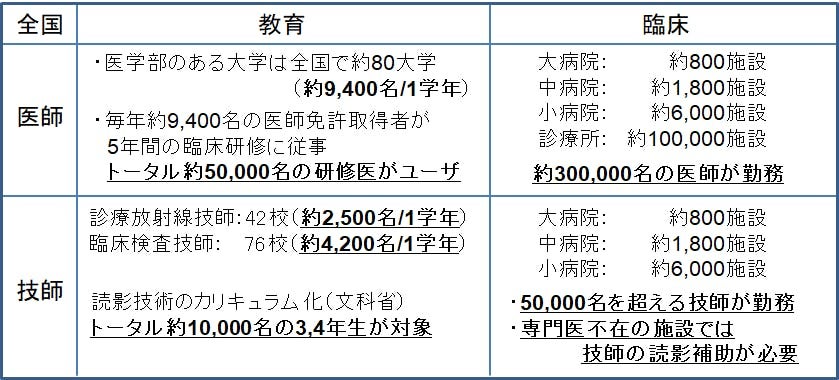 以下に、医師、技師、教育、臨床の各ユースケースにおける、各医療従事者の配置および人数について示します。新型コロナウィルスにより臨床研修・病院実習が制限されている今、臨床経験の習得をサポートするためのコンテンツやサービスの普及が必要です。