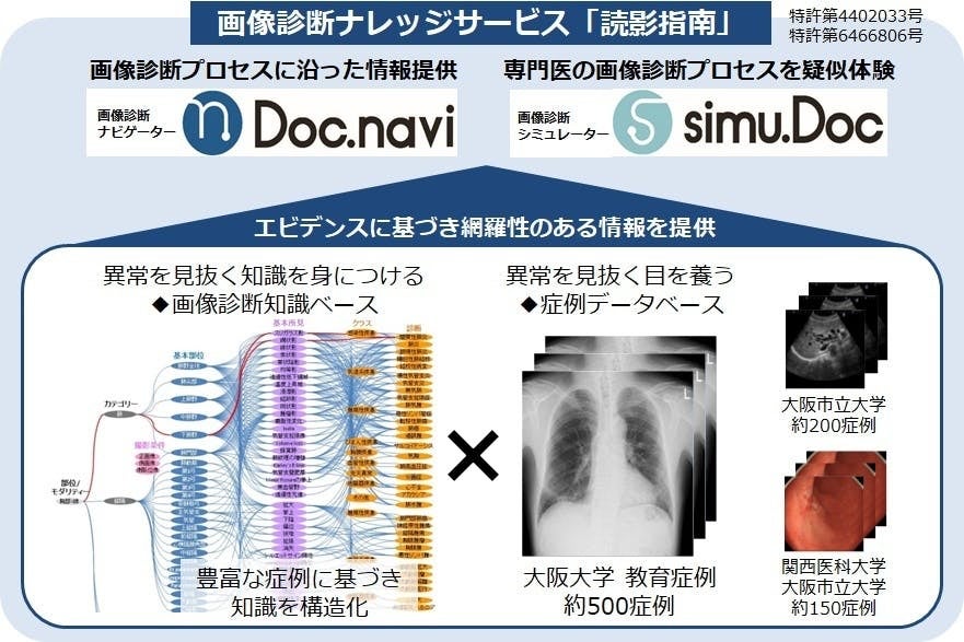 これらの「画像診断知識ベース」「症例データベース」から知識(ナレッジ)を的確に取り出すことを目的とし、“画像診断ナビゲーター(Doc.navi)” と “画像診断シミュレーター(simu.Doc)” を開発しました(下図参照)。その結果、”画像診断ナレッジサービス「読影指南」”は初学者から専門医を目指す医療従事者に対して以下の機能が提供できます。