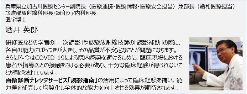 厚生労働省ではこの問題に対応すべく「チーム医療の推進」(医政発0430第1号 各都道府県知事宛)として、専門医以外の医師が画像診断を実施することを想定し、技師も加えた「チーム医療の推進」を実施することを各都道府県知事に通知しています。しかし、すべての医師や技師が、10年の月日が必要な専門医のレベルに容易に到達できるわけではありません。そこで画像診断をサポートするためのコンテンツやサービスが必要となります。
