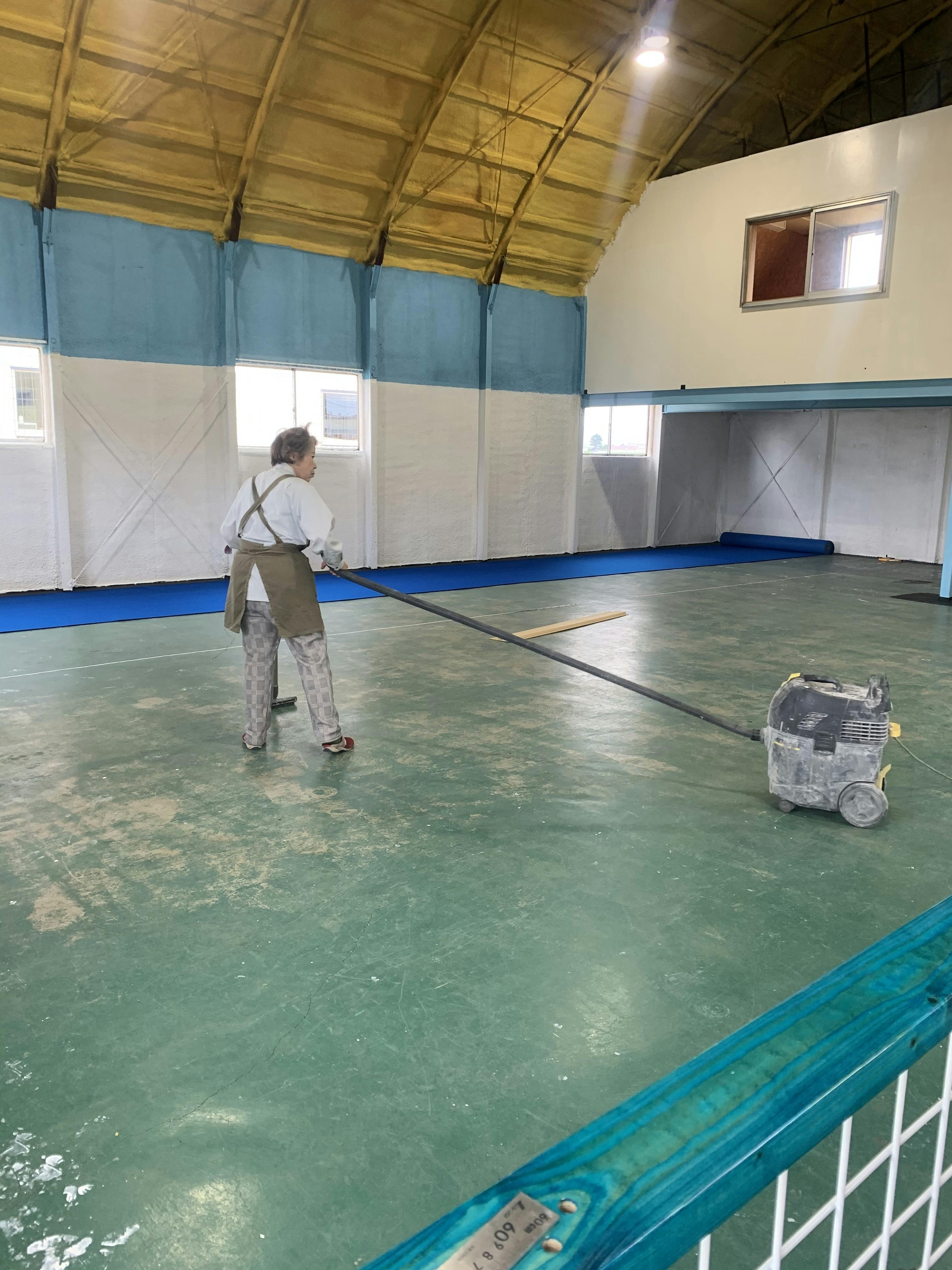 今日は施設内の下地カーペットを貼りました。まずは床掃除。