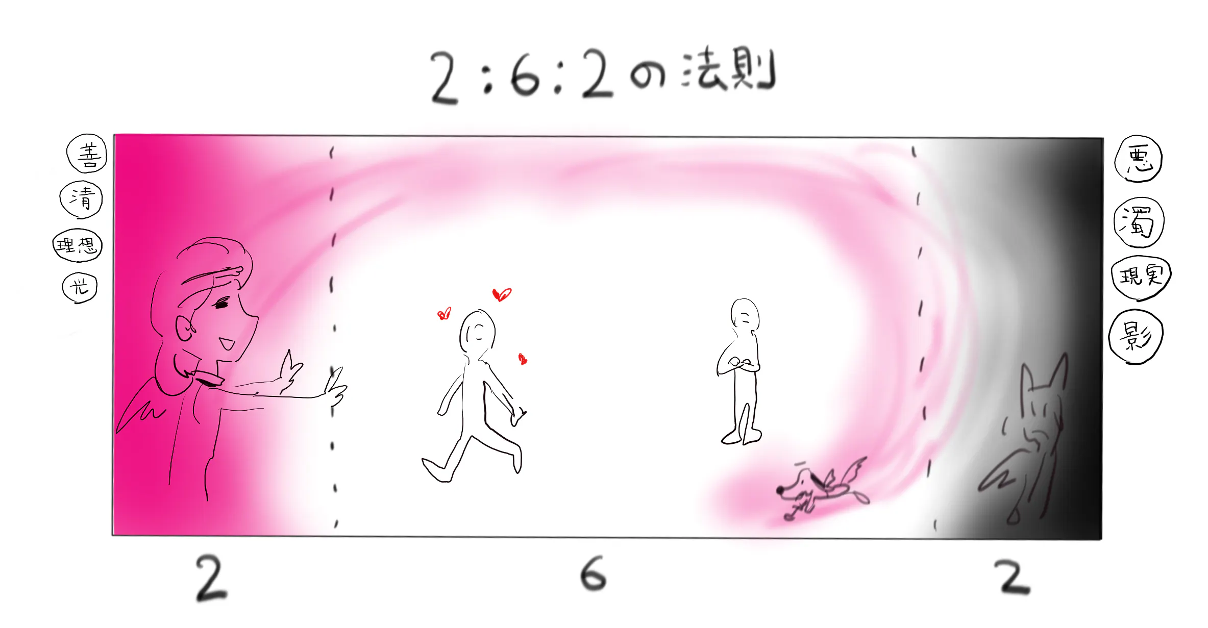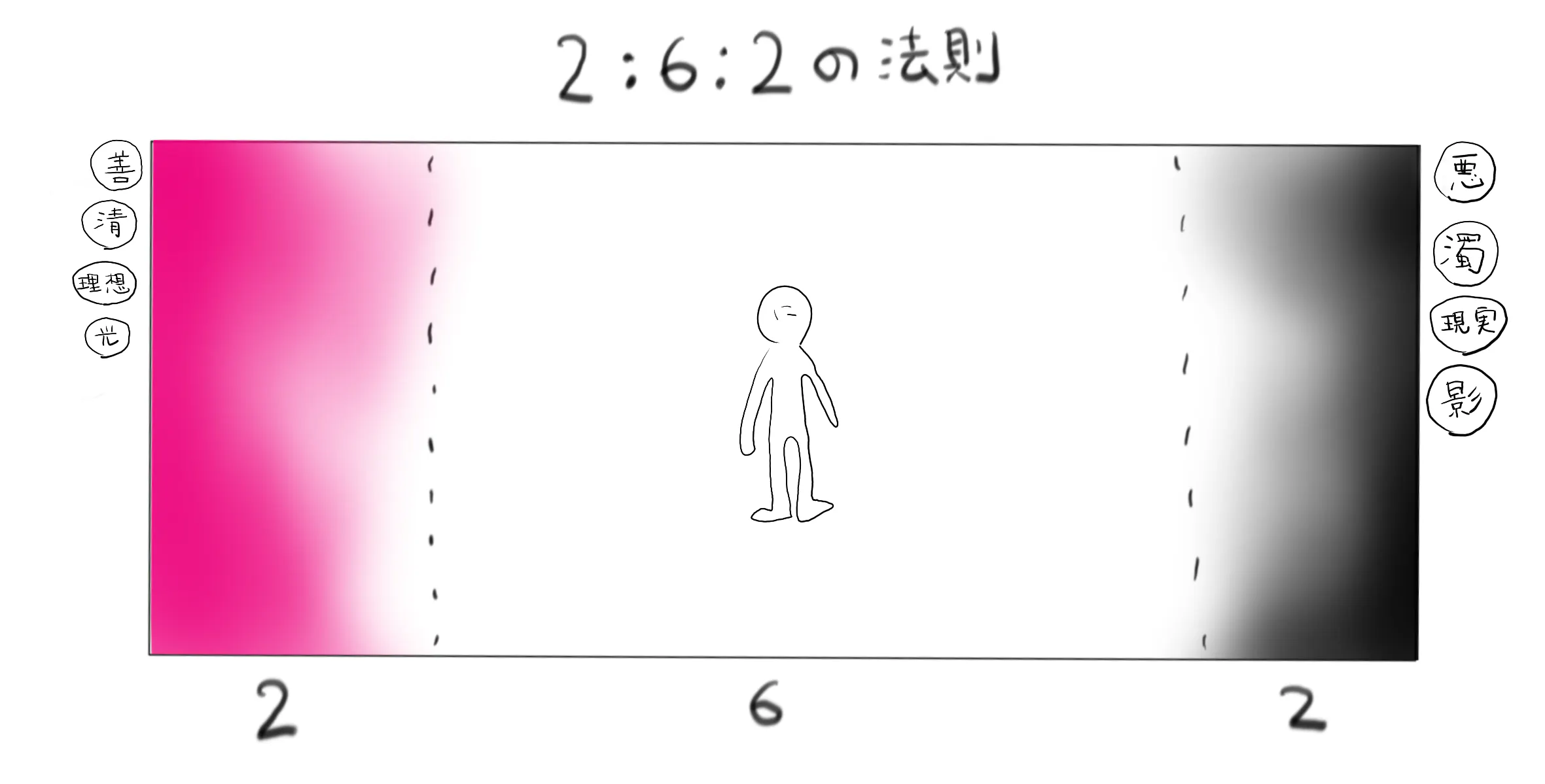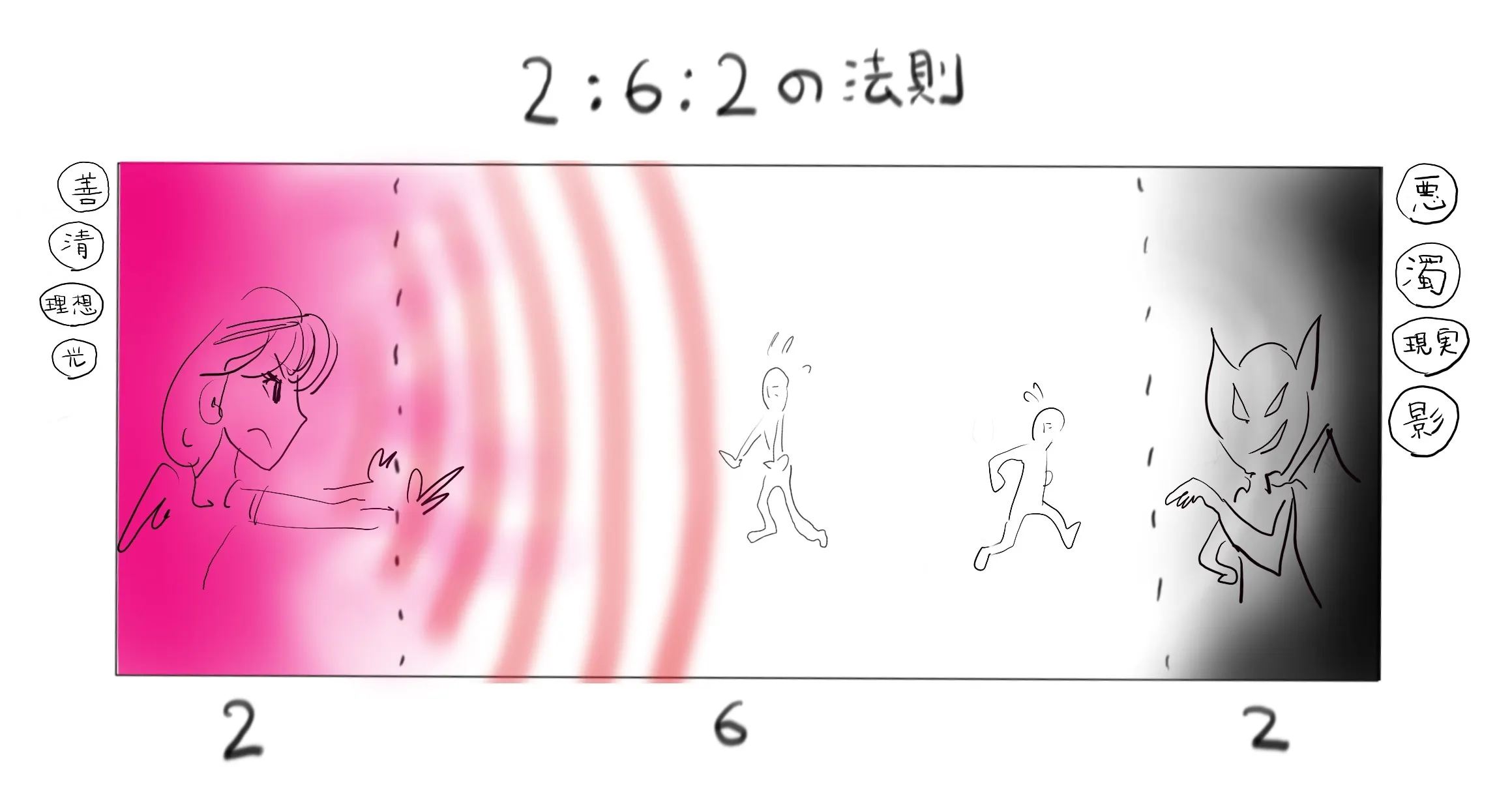 「善と悪」「光と影」「清と濁」「理想と現実」 どんな問題にも答えを求めると両極に『2:2』のが来る。よって世論を制するためには間の『:6:』の層が握っているという法則だ。