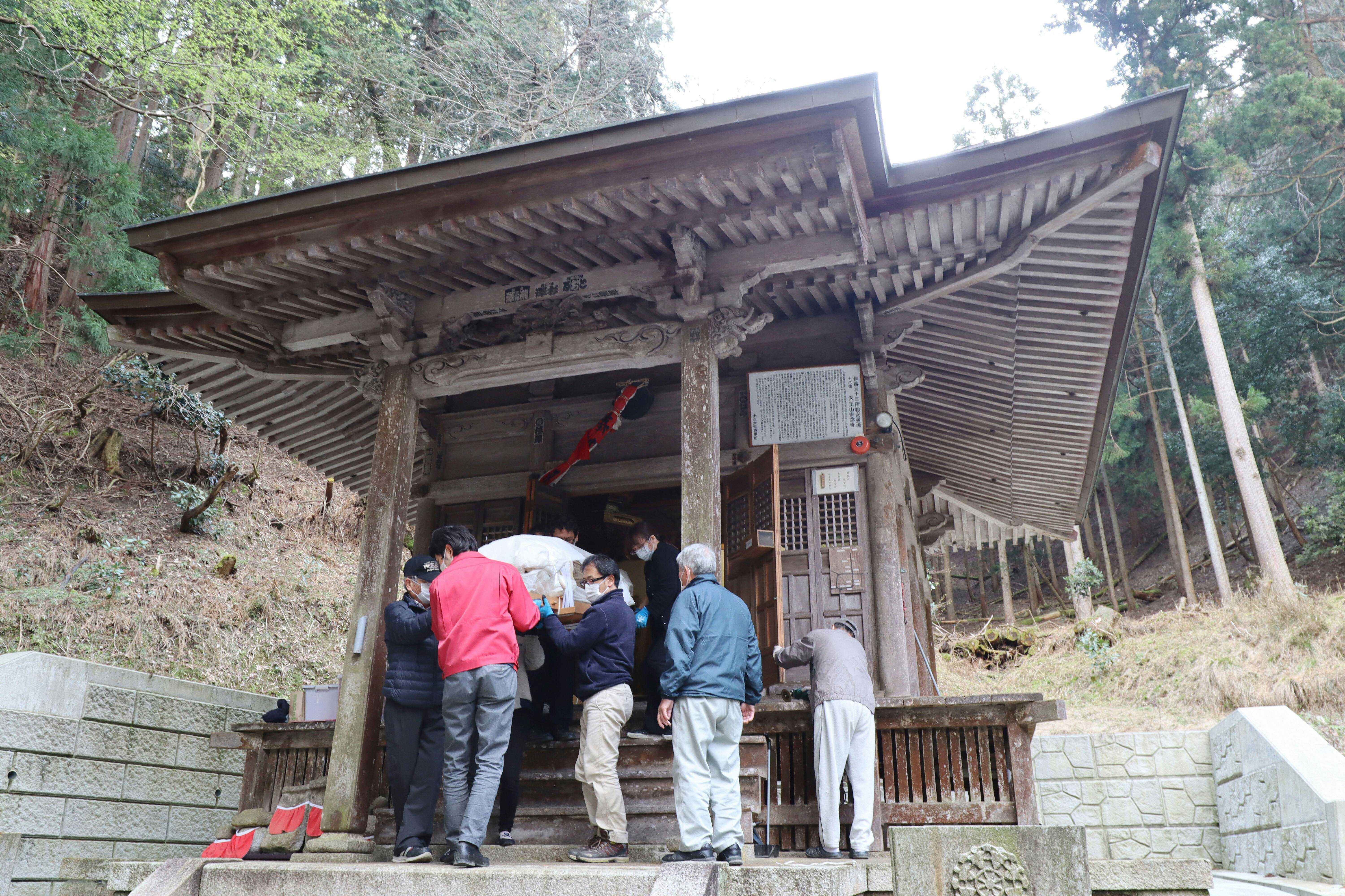 ▼保存会の方が靴を履きやすいようにサポートされる中、いも観音さんたちは堂外へ。