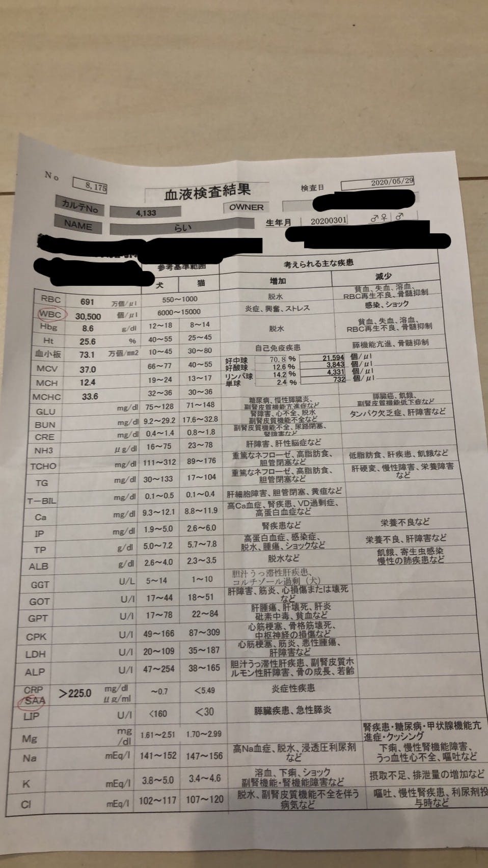 朝から病院に連れて行くと熱が40度。採血の結果炎症反応が通常の40倍以上あり、かかりつけだった動物病院さんの測定器ではこれ以上の数値が出ないので本来もっと数値が高いかもしれません。といわれました。
