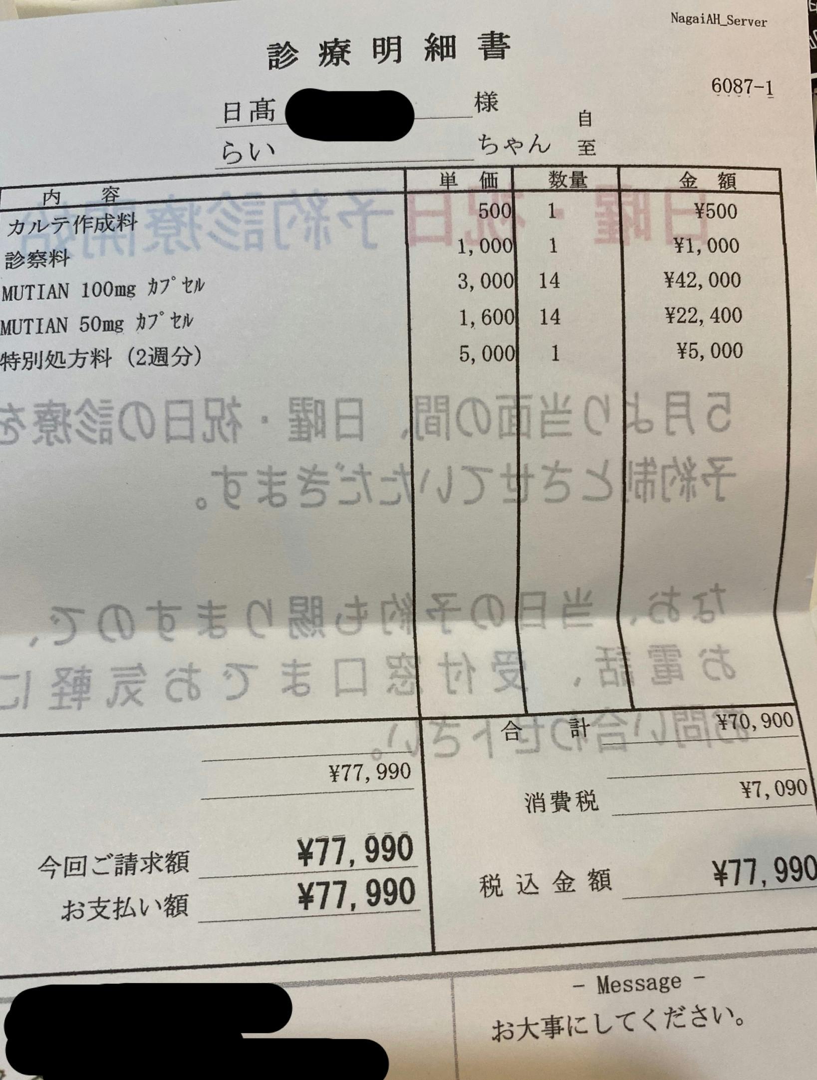 2週間で増えるわけではなく細かく体重により投薬量が増えていくので、順調に成長していくと仮定したお薬代+手数料(17%)+税で1045000円になります。