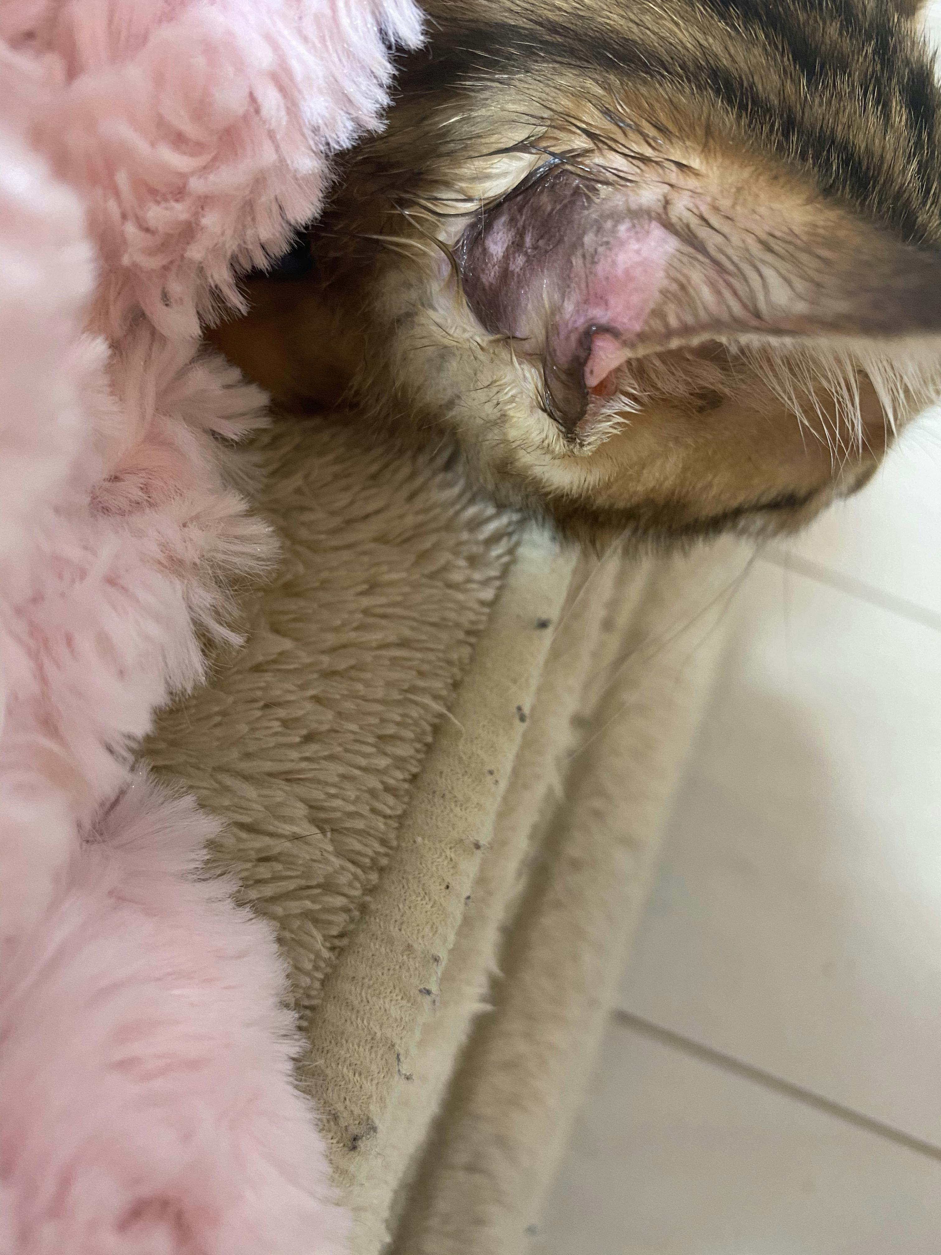 お迎えした時から耳の後ろに脱毛があり次の日から病院に通いました。