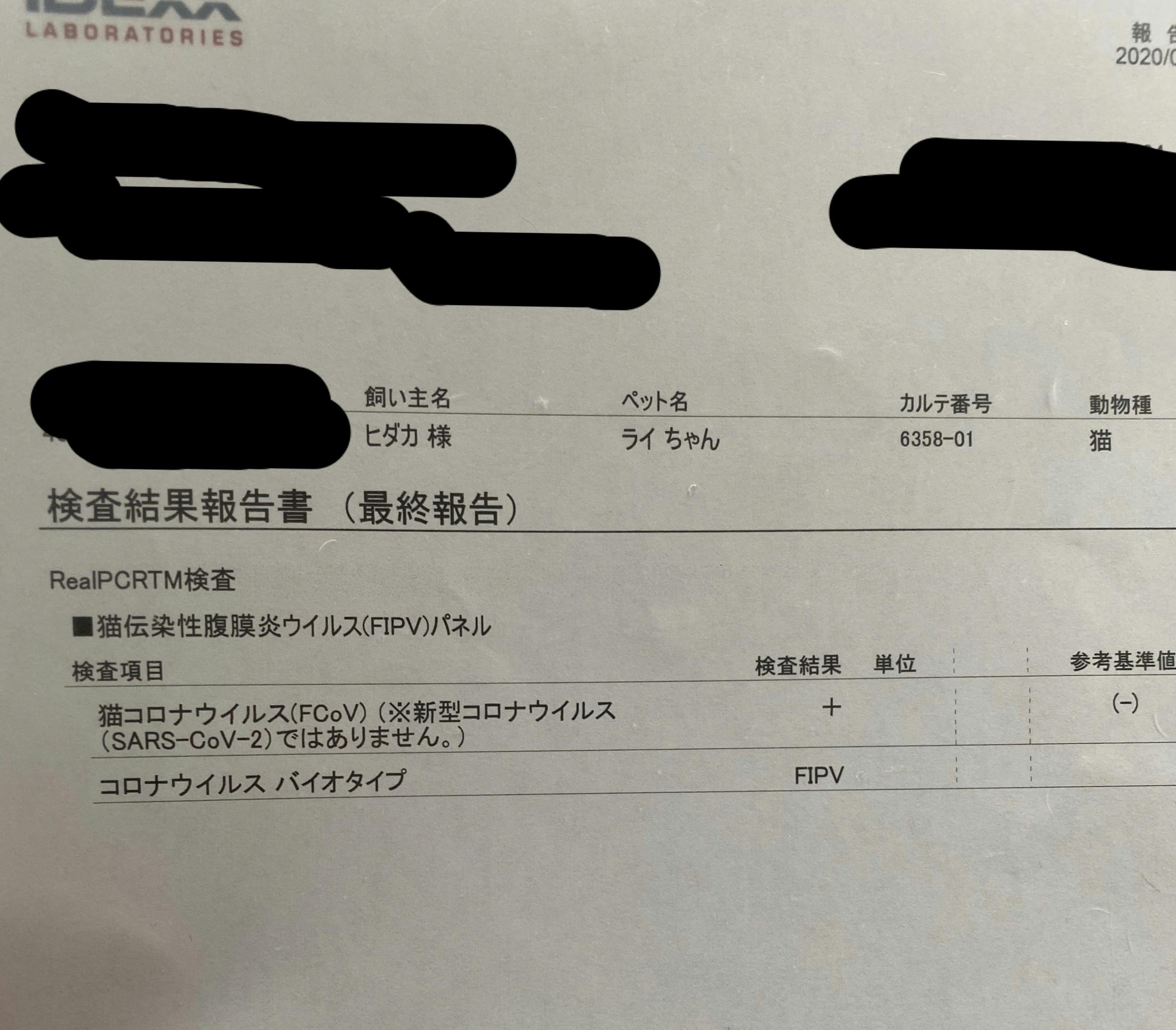 この病気は診断が難しいそうで検査の結果が陰性と出ても総合判断からFIPと診断をすることも多いそうですが、らいの場合は症状と陽性反応から確定です。
